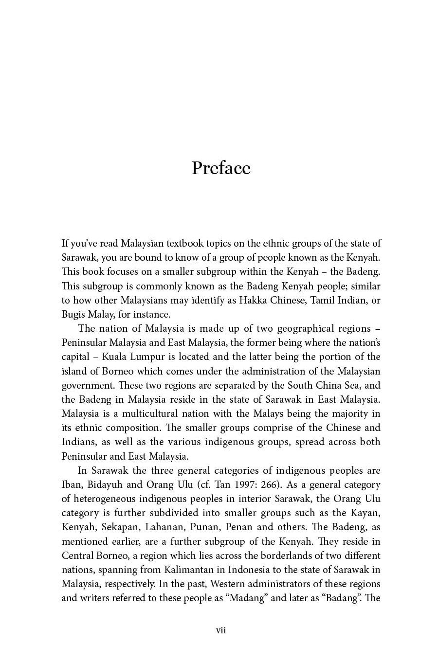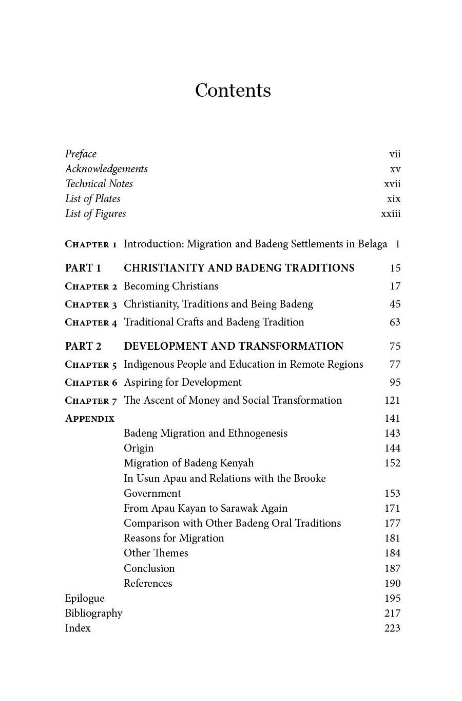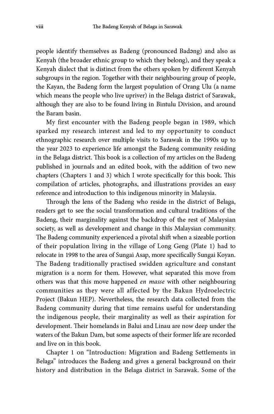 The Badeng Kenyah of Belaga in Sarawak: Marginality, Changing Traditions and Development explains the history, culture and development of the Badeng Kenyah in Belaga District, Sarawak. Their cultural identity predates the arrival of the Brookes, the formation of Malaysia, and continues to inspire change in their community and beyond to this day.
