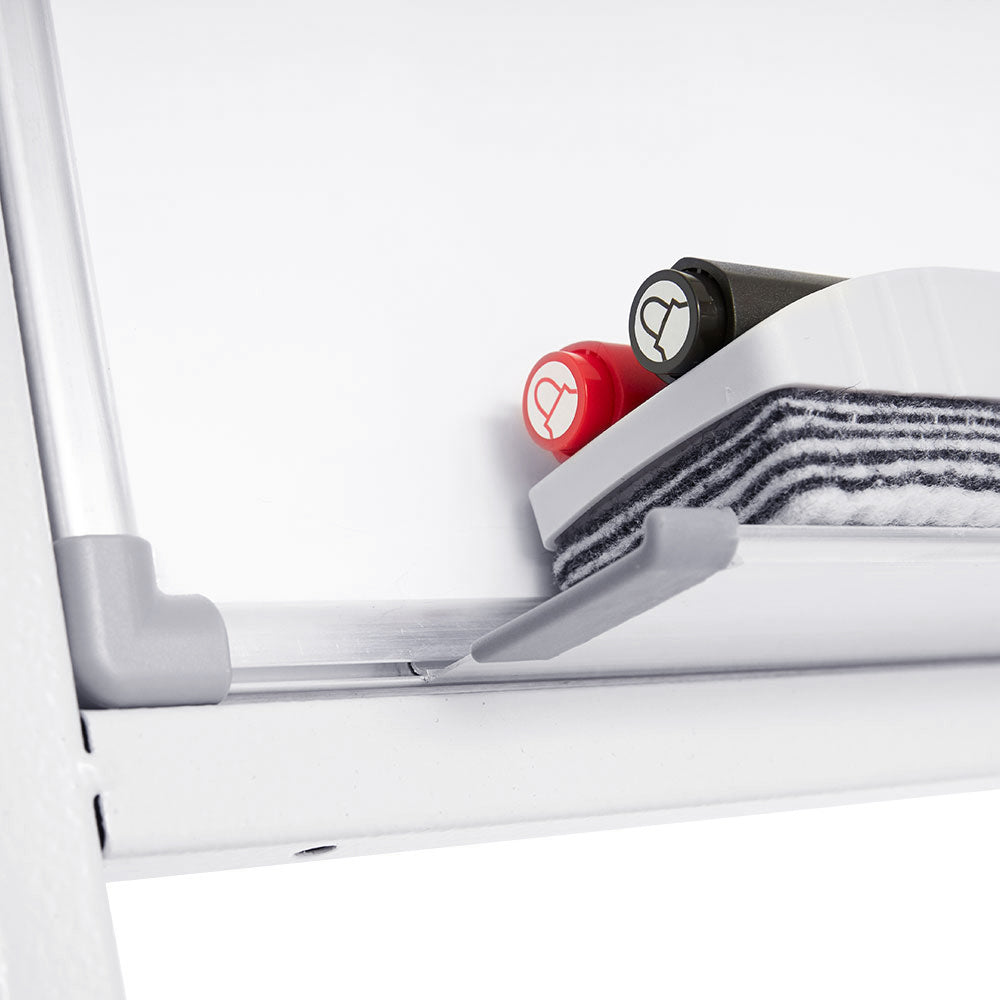 Whiteboard surface. Spring clamp system. Lightweight and foldable for easy storage and portability. Foldable pen-tray. Writing area: 60cm x 90cm. Assembled height: 105cm - 186cm. Available with castors