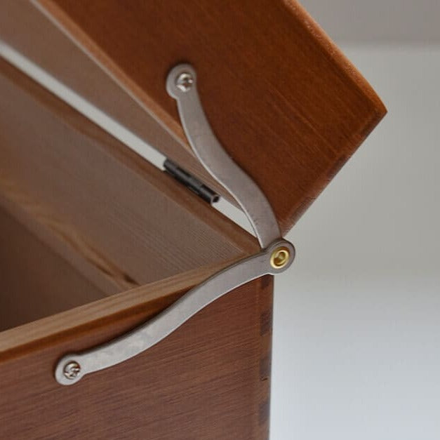 An exquisitely designed wooden toolbox with a removable tray, handcrafted with precision in Japan. This beautiful toolbox features remarkable details, including ornamental hinges, a sturdy metal handle on the top, and a built-in caddy in the lid for additional storage.