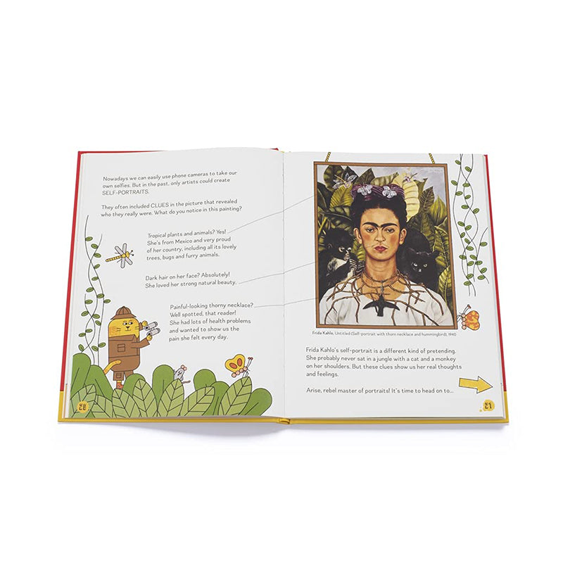 Under the playful guidance of Leo, the museum cat, readers encounter abstract, Surrealist, nude and contemporary art, ancient sculpture, still lifes and portraits. But instead of being told facts to memorize, they’re equipped with the knowledge that allows them to come up with their own interpretations of famous art works. Knowing how symbols work, they’ll decipher clues in Frida Kahlo’s self-portrait; understanding Surrealism, they’ll decide for themselves what Joan Miró’s abstract doodles are all about.