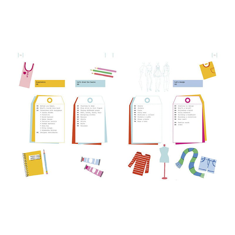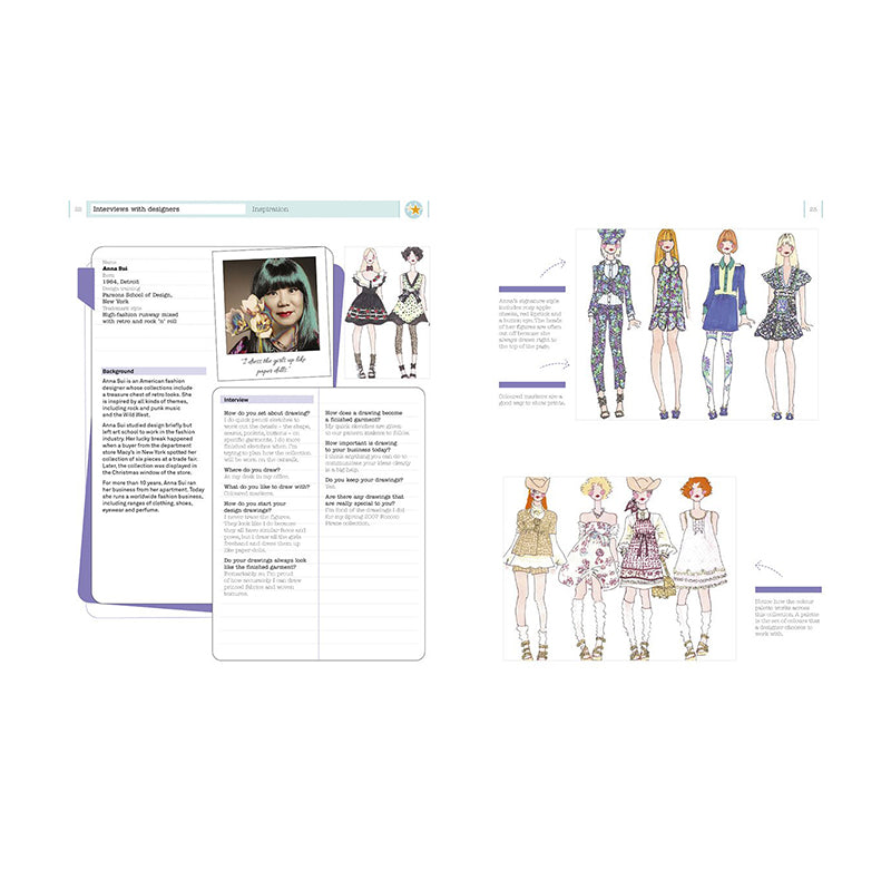 This is a beginners’ step-by-step guide to drawing like a fashion designer. The book is aimed at young people who are keen to learn how to draw fashion figures and outfits. At the beginning of the book, leading fashion designers explain why drawing is so important to the design process, with examples from their sketchbooks for inspiration. Then there are sections that show how to create a fashion template ( croquis ), including fashion proportions and how to turn a stick figure into a full figure; how to draw skirts, trousers, jackets and dresses onto the fashion template; and how to develop a collection, including the creation of complete outfits and seasonal looks. Towards the back of the book there’s a section that looks at the design process, from creating a mood board and following a brief to developing a collection.