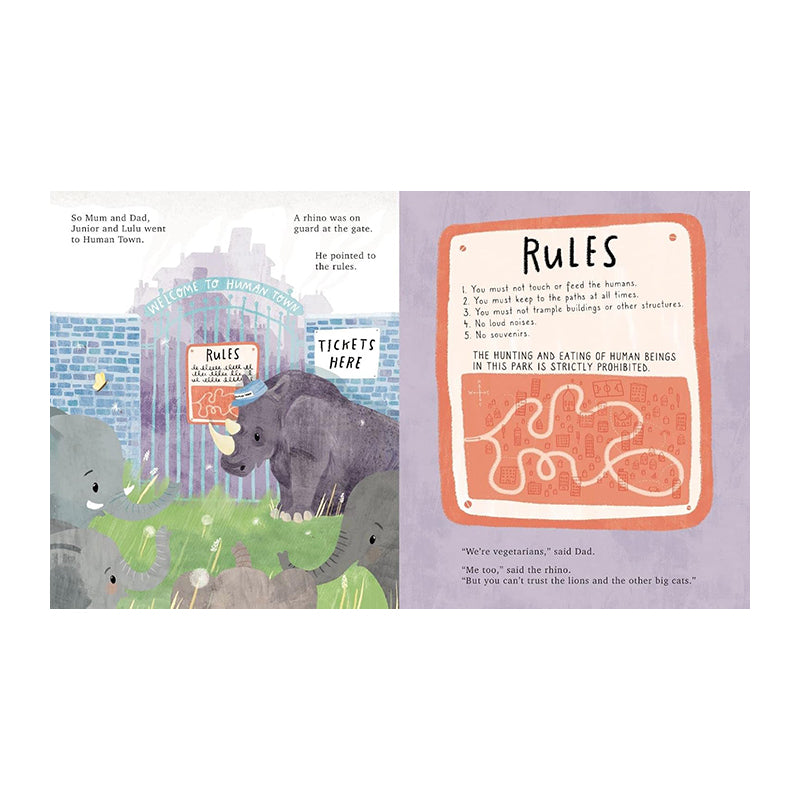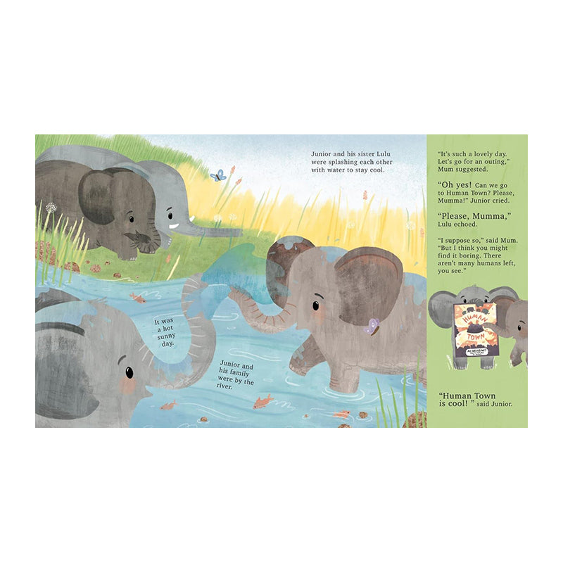 Junior and his elephant family are excited to visit Human Town, where they can observe humans in their own town! The novelty soon wears thin, as they notice major issues humans have caused, which are causing them to become extinct. Junior hopes that this will never happen to the elephants.