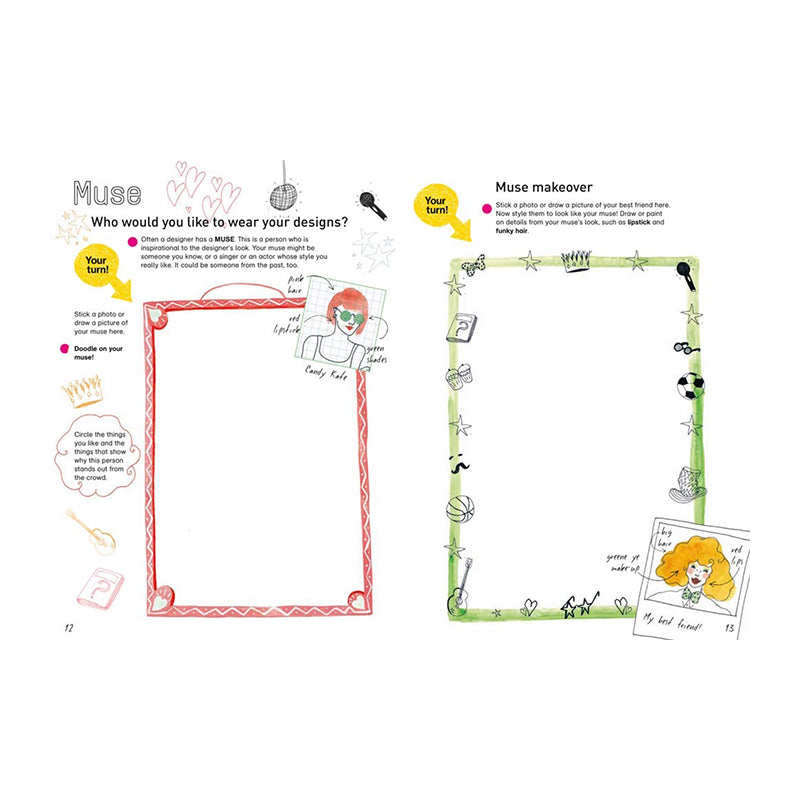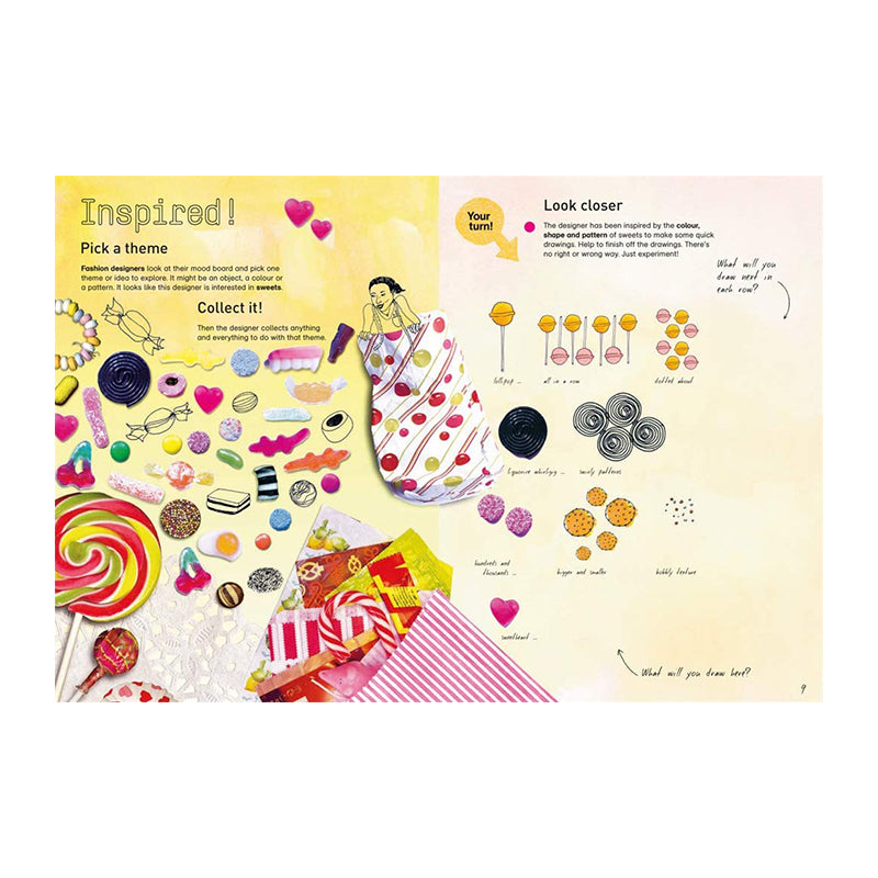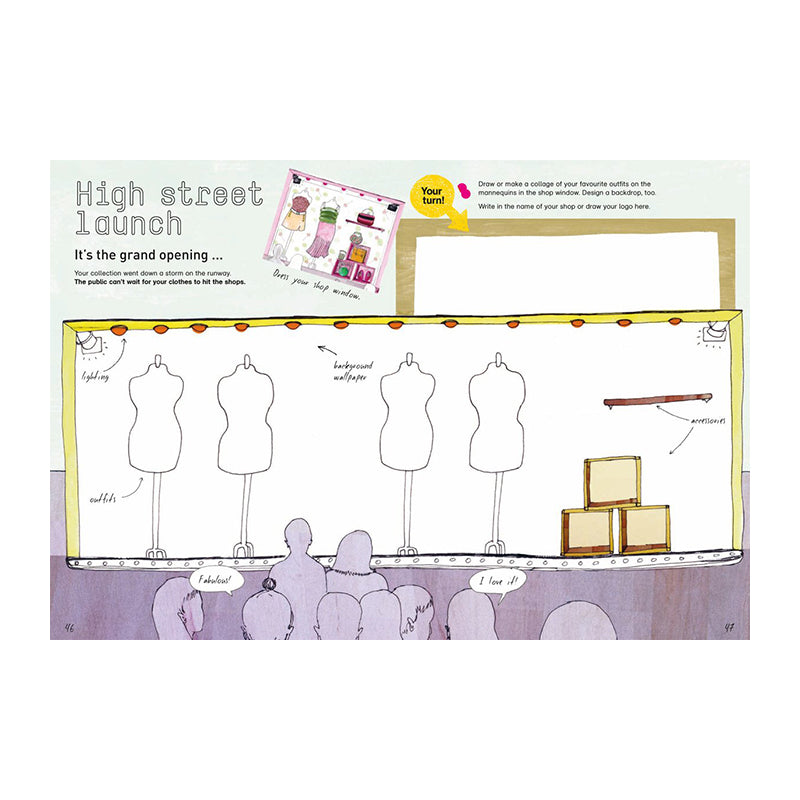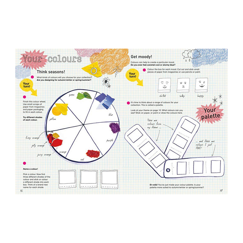 This is a hands-on, write-in, look-and-feel sketchbook. Children follow the process of a real fashion designer to create their own fashion collection. This includes finding inspiration, making a mood board, collecting and gathering research, choosing colours and a defining silhouette, experimenting with fabrics, print and pattern, building a capsule selection of garments into a collection, and then creating a ‘lookbook’ to show off the new range. There are also spreads about preparing for the runway show, including hair and make-up. Finally, there’s the high-street launch to consider. The book is aimed at children aged eight and over, but older children and younger teens should also find plenty to keep them inspired. Has the genuine feel of a real sketchbook: it has an elastic closure, and the front cover is die-cut so that the child can sign the title page beneath to make their own fashion-label logo.