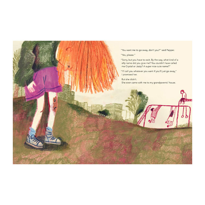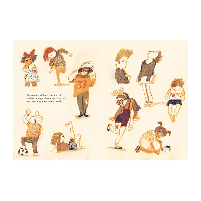 When a little girl falls on the street, scraping her knee, her father tells her not to worry, that 'a beautiful scab will form'. But she does worry! The scab is not beautiful and it's keeping her from bending her knee! When will it ever go away? By the time the scab - who she has named Pepper - falls off, something astonishing has happened: the girl has come to feel affection for the scab and has a hard time letting go.