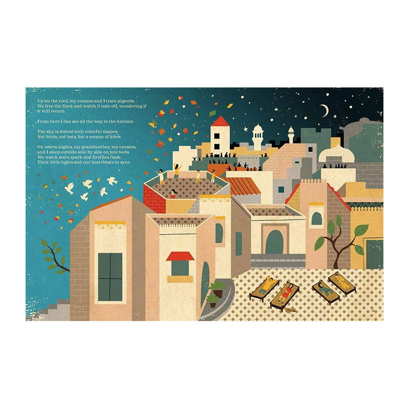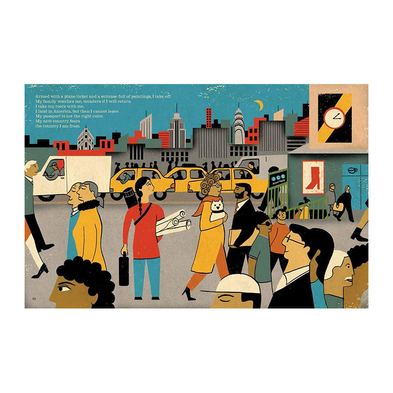 Young Shahzia lives in a multigenerational, multicultural home in Lahore, Pakistan. She sees bustling crowds and vibrant energy everywhere she looks. She enjoys the food, rituals, and love of her large extended family’s Muslim traditions while soaking up the world around her through Russian fairy tales, American Westerns, and Bollywood films. She also reads poetry in Urdu, her own language, and learns the slow and detailed painting technique of Indo-Persian miniatures. Her art takes her around the world, and she brings her roots with her.