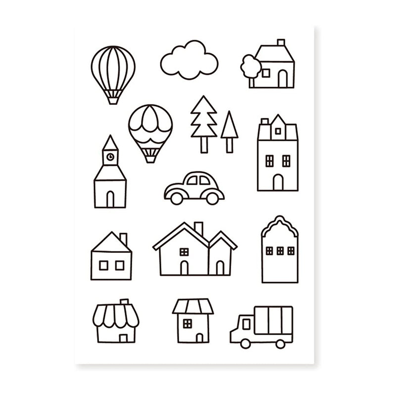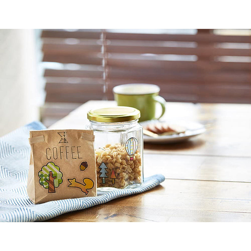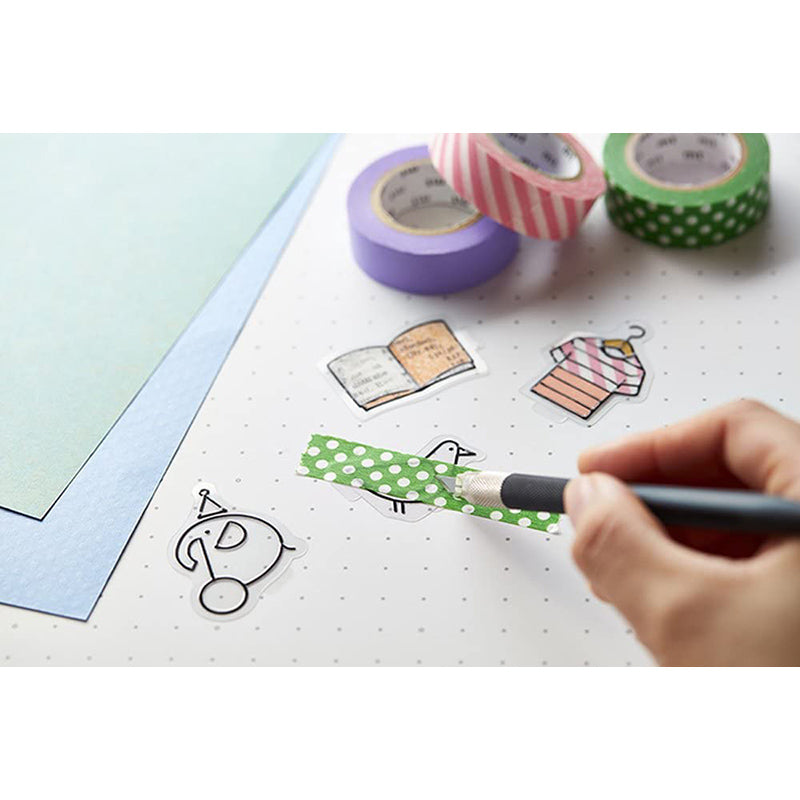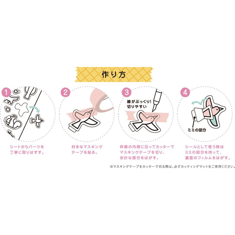 It is a sticker that can freely combine colors and patterns with a feeling like coloring by cutting and pasting your existing masking tape to match the frame line printed on the transparent sheet. The way to make it is to separate the parts of your favorite symbol from the sheet, paste the masking tape, and cut off the protruding part with the cutter along the inside of the frame line. The frame line is plumped and raised, it becomes a guide when cutting with a cutter. After completion, you can peel off the film on the back side and stick it as a seal.