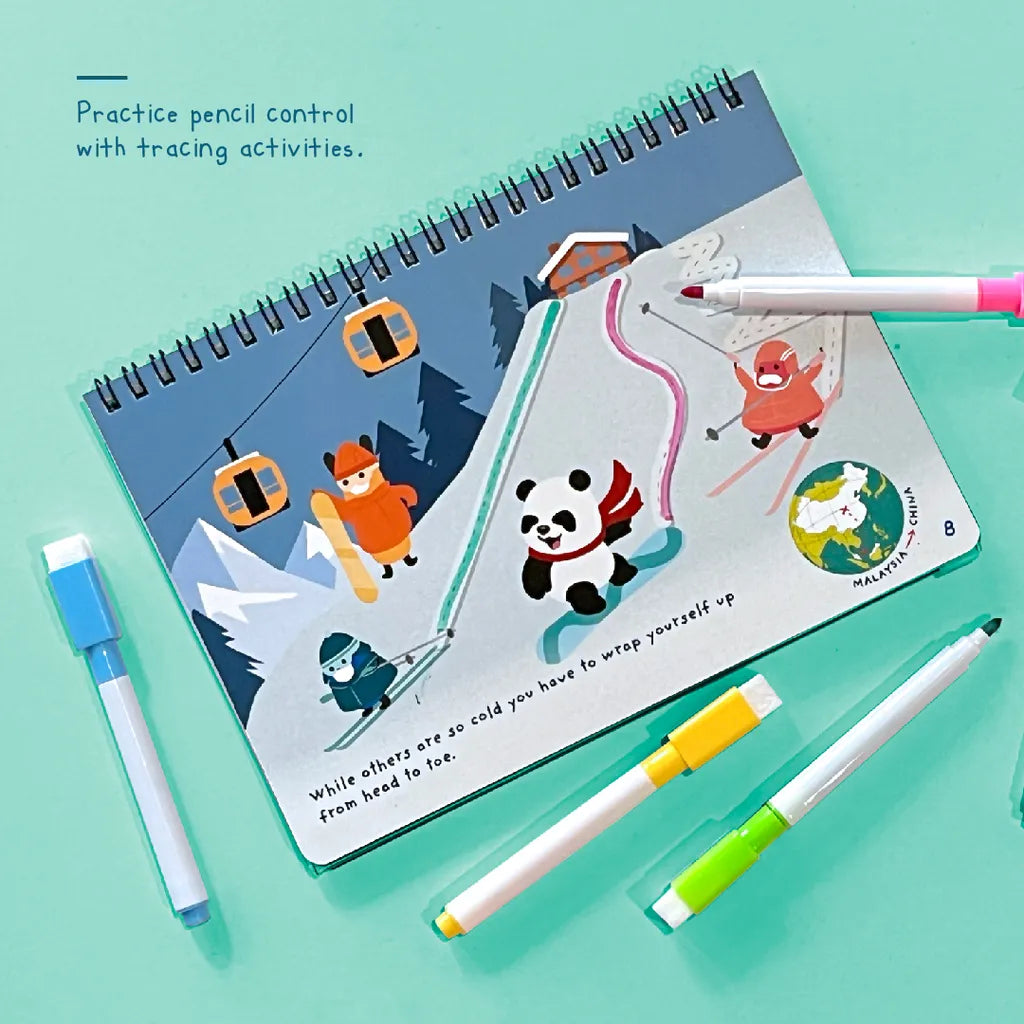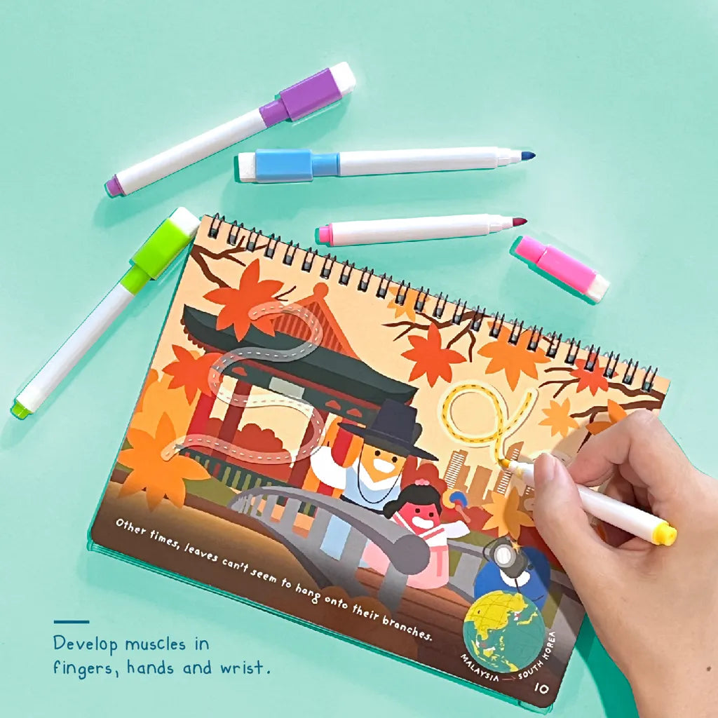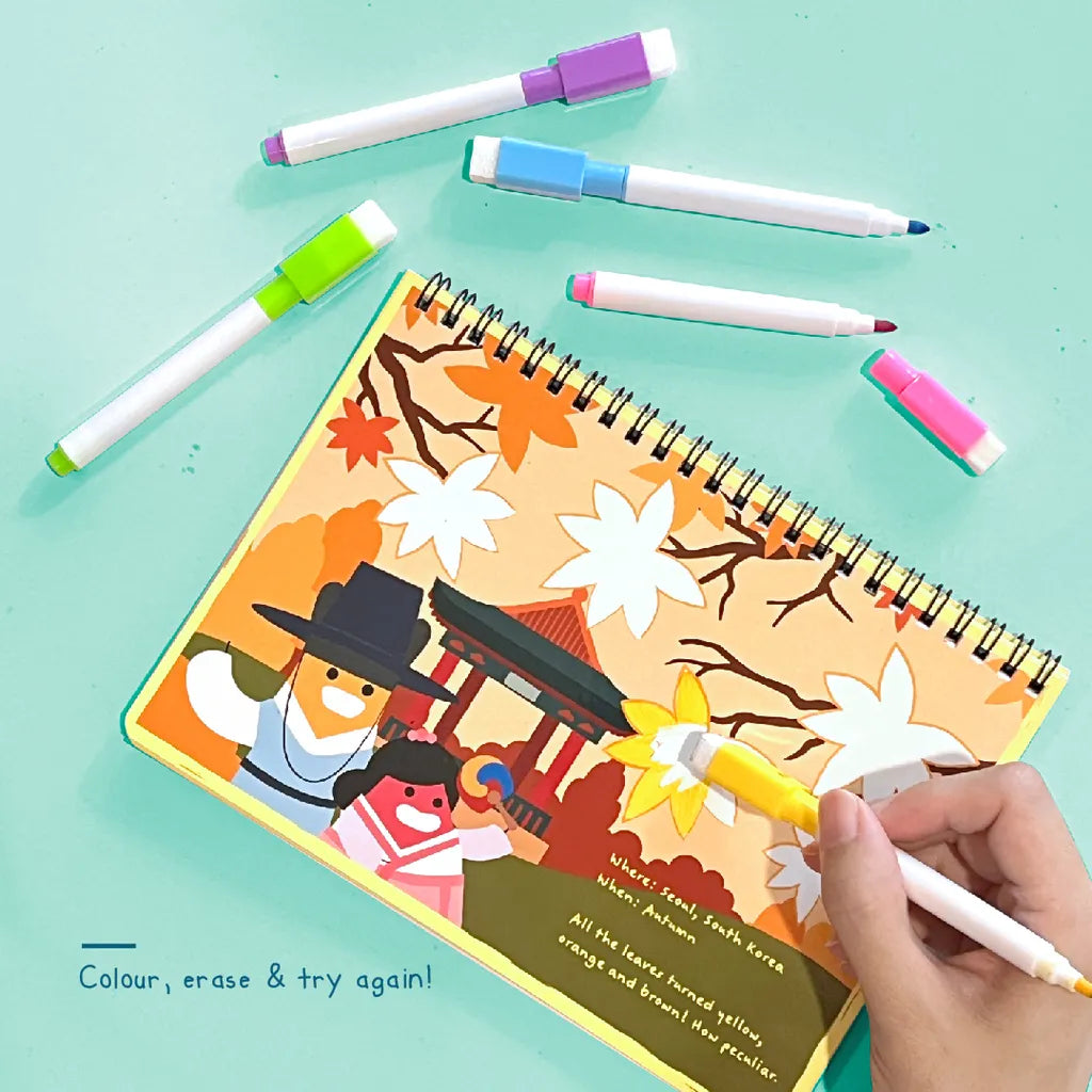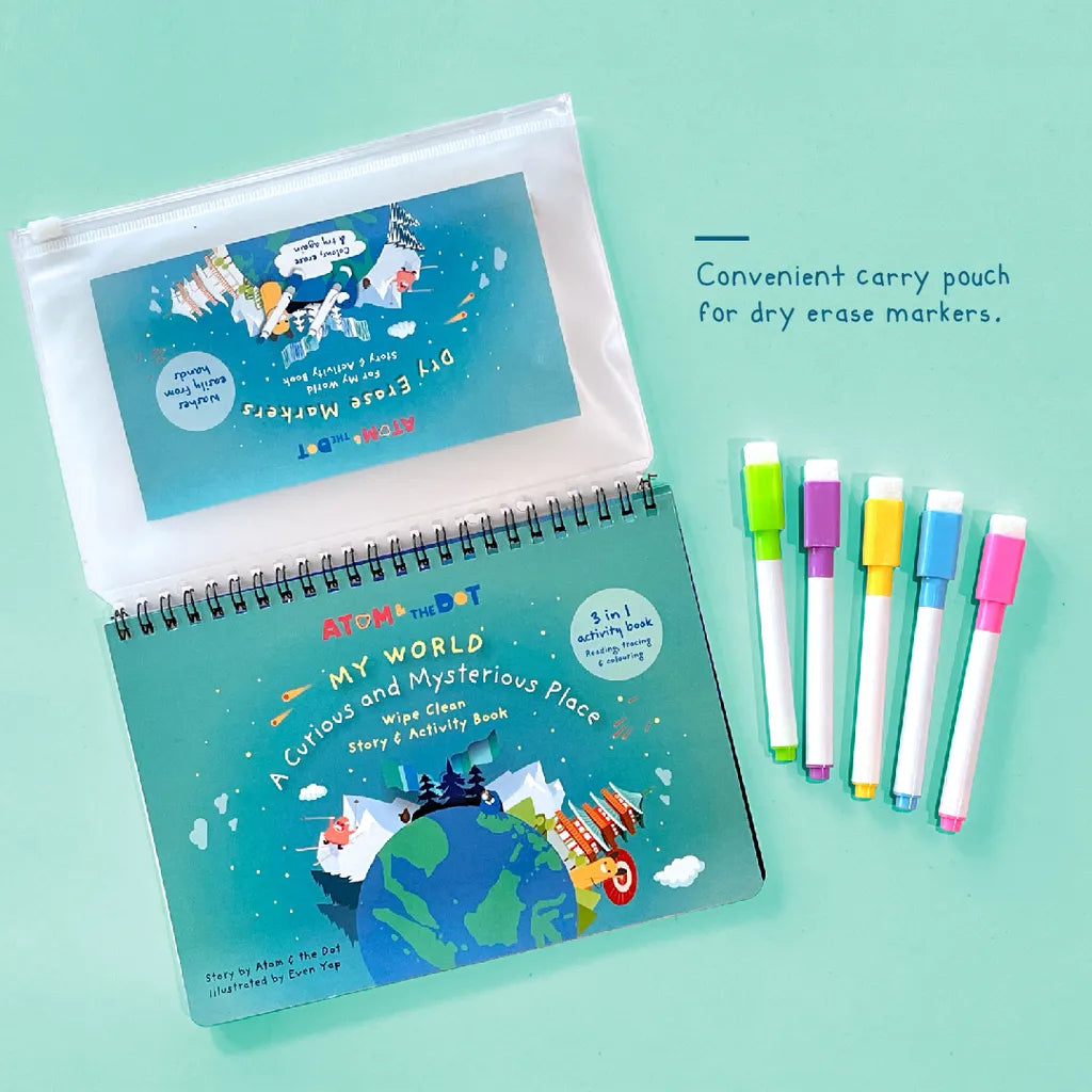 This reusable book comes with dry erase markers in a convenient carry pouch.