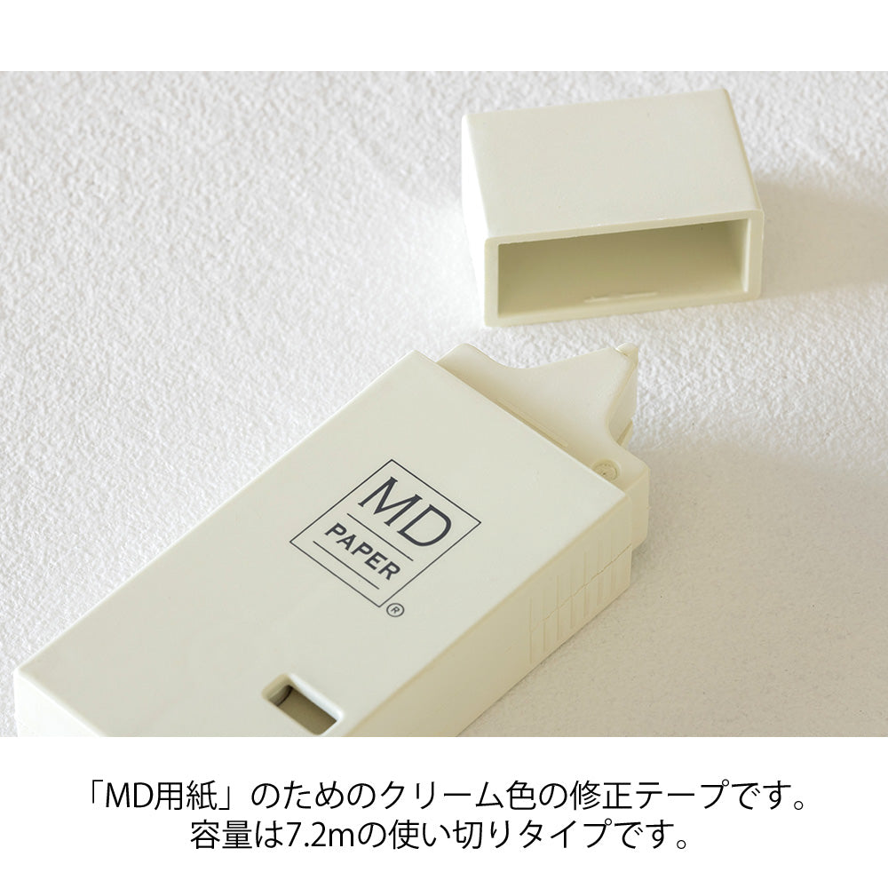 A cream-colored correction tape for MD PAPER. The tape is 6 mm wide to fit into the ruled line of the MD Notebook. It is 7.2m and disposable. Specifications:- Made of MAPUKA, synthetic resin with paper powder / 6mm wide x 7.2m / Disposable / in paper case // Size - Package: H116 × W52 × D15mm / Item: H68 × W27 × D13mm // Country of Origin: CHINA // Material: MAPUKA.
