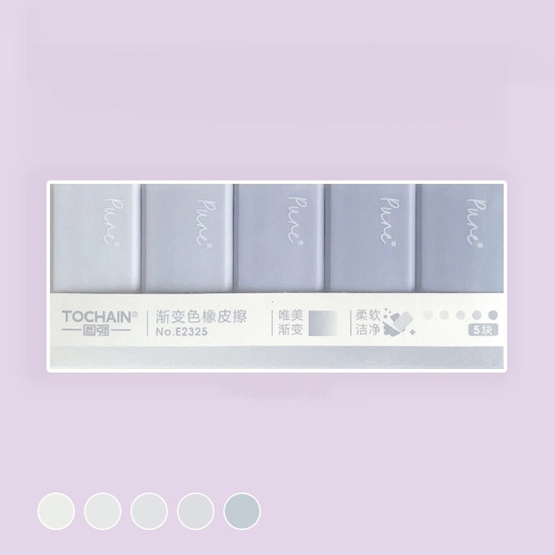 A set of five premium-quality erasers in softly graduated pastel shades, perfect for everyday use or as a stylish addition to your stationery collection. Each eraser is designed to remove graphite cleanly without tearing or smudging, while the gentle colors—from light to deep pastel tones—add a calming touch to your desk. Beautifully simple and functional, this set is ideal for school, work, or gifting.