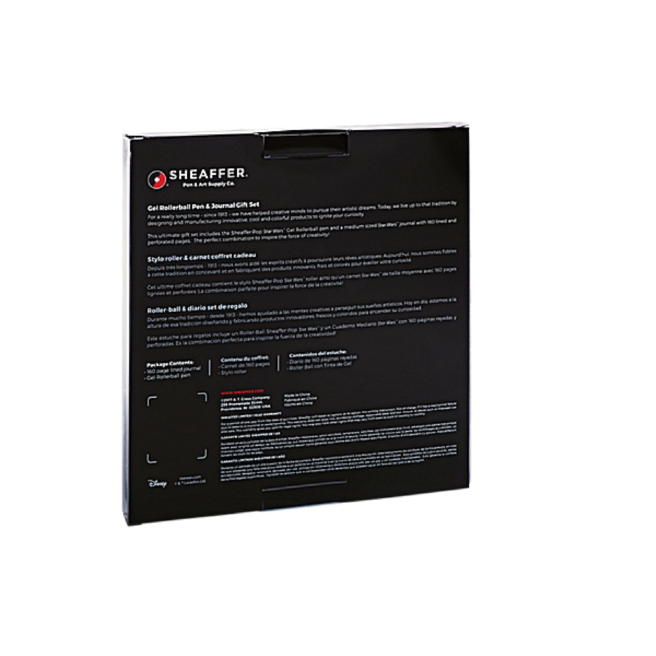 If you’re a Star Wars fan, don’t be shy about letting the whole galaxy know! This alliance of gel rollerball pen and notebook features a bold design that’s sure to get noticed in any meeting or classroom. Choose from some of the most iconic characters in the Star Wars saga, and then watch as the force of your creativity is awakened! Star Wars themed journal with 160 lined and perforated pages. Journal has a ribbon page marker and expandable inner pocket. Gel rollerball pen features a light plastic barrel with Star Wars themed finishes. Features the Sheaffer White Dot®, the trademark symbol of writing excellence. Presented in a gift box. Limited one-year warranty on the pen.