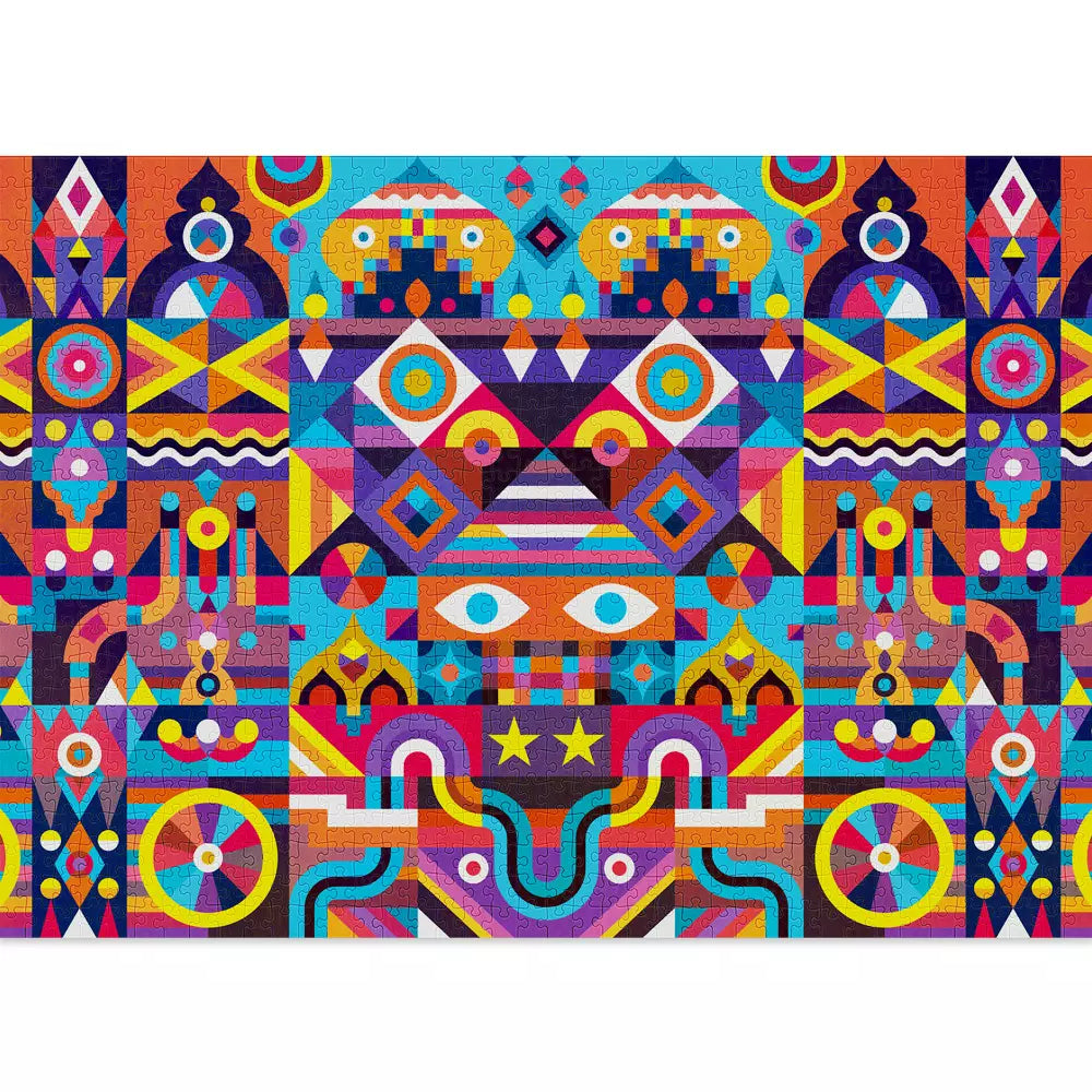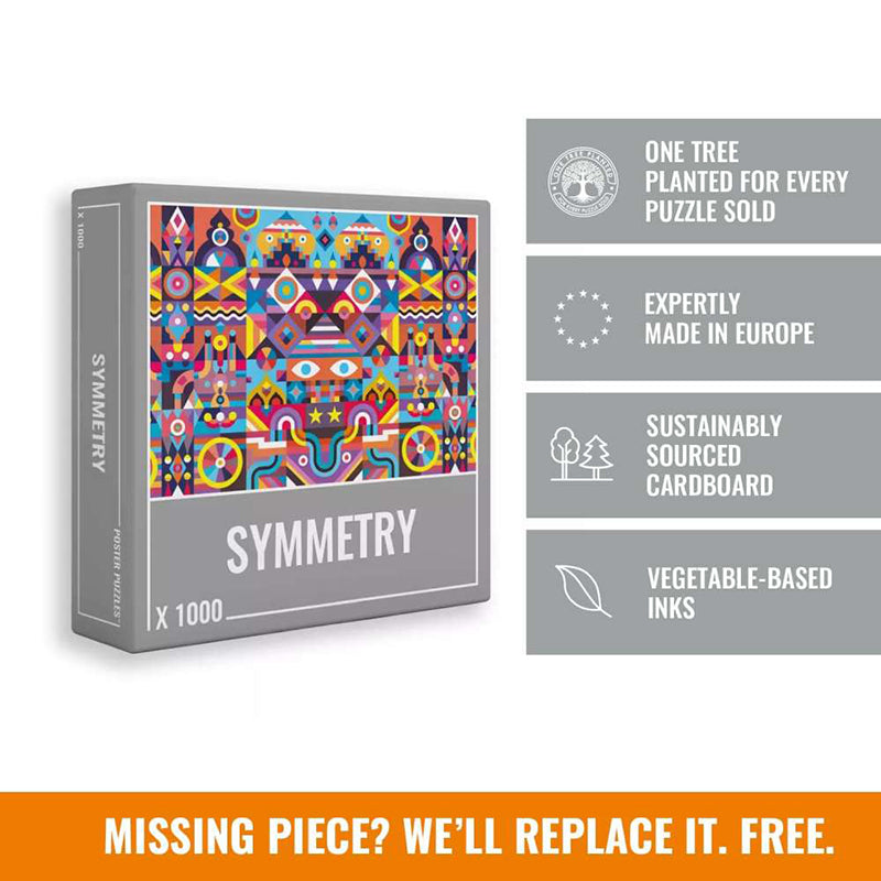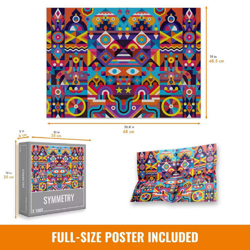 Get lost in a vibrant world of colours and shapes with our SYMMETRY jigsaw puzzle. With swirling, colourful wheels, symmetrical geometric patterns, and cool star motifs, it's a real treat for puzzlers looking for an extra challenge. Crack the code to reveal a piercing set of blue eyes staring back at you from the centre of the finished piece!