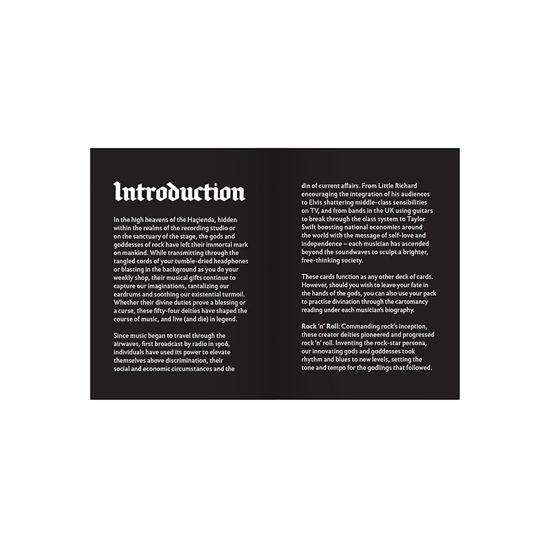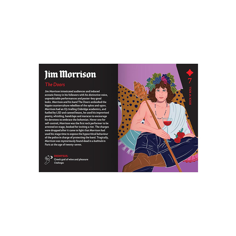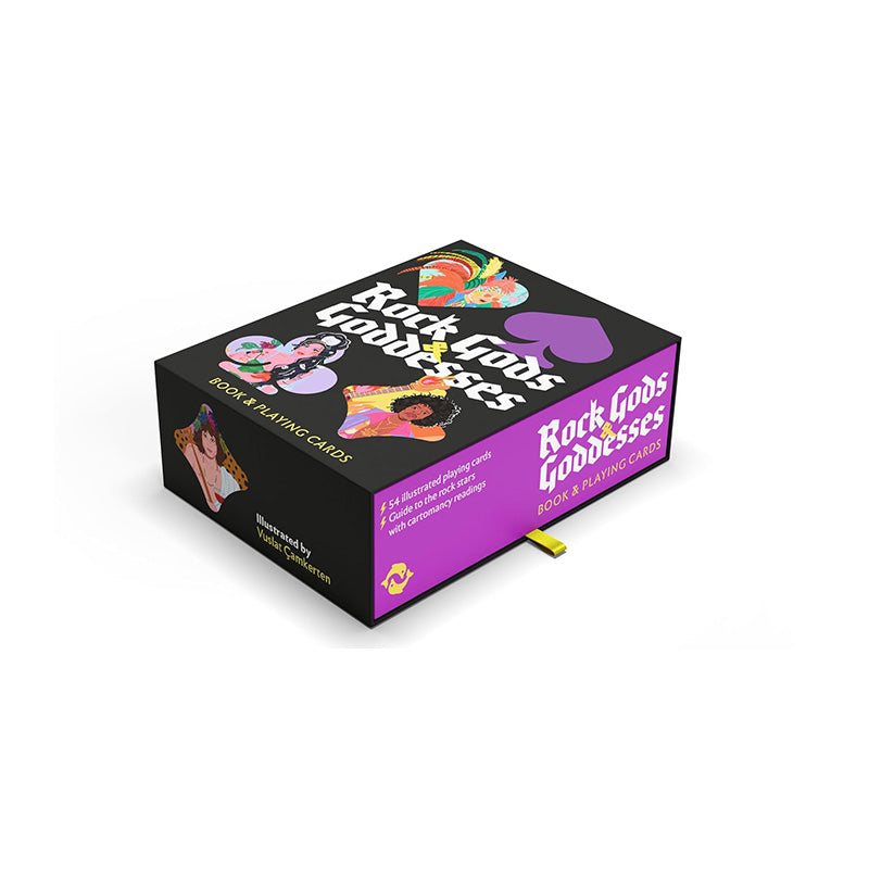 Ever wondered what deity your favourite rock god or goddess would be? Legendary rock stars are immortalized as divine beings in this card deck with fifty-four beautiful illustrations by artist Vuslat Çamkerten. Rock Gods & Goddesses features the titans of classic rock, the mavericks of the underground, the punks of heavy metal and the princes and princesses of pop rock.