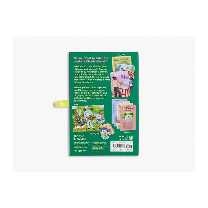 Open the box and step into the world of Claude Monet with a 150-piece puzzle, twenty-four activities, a fact-filled fold-out and an iron-on patch.