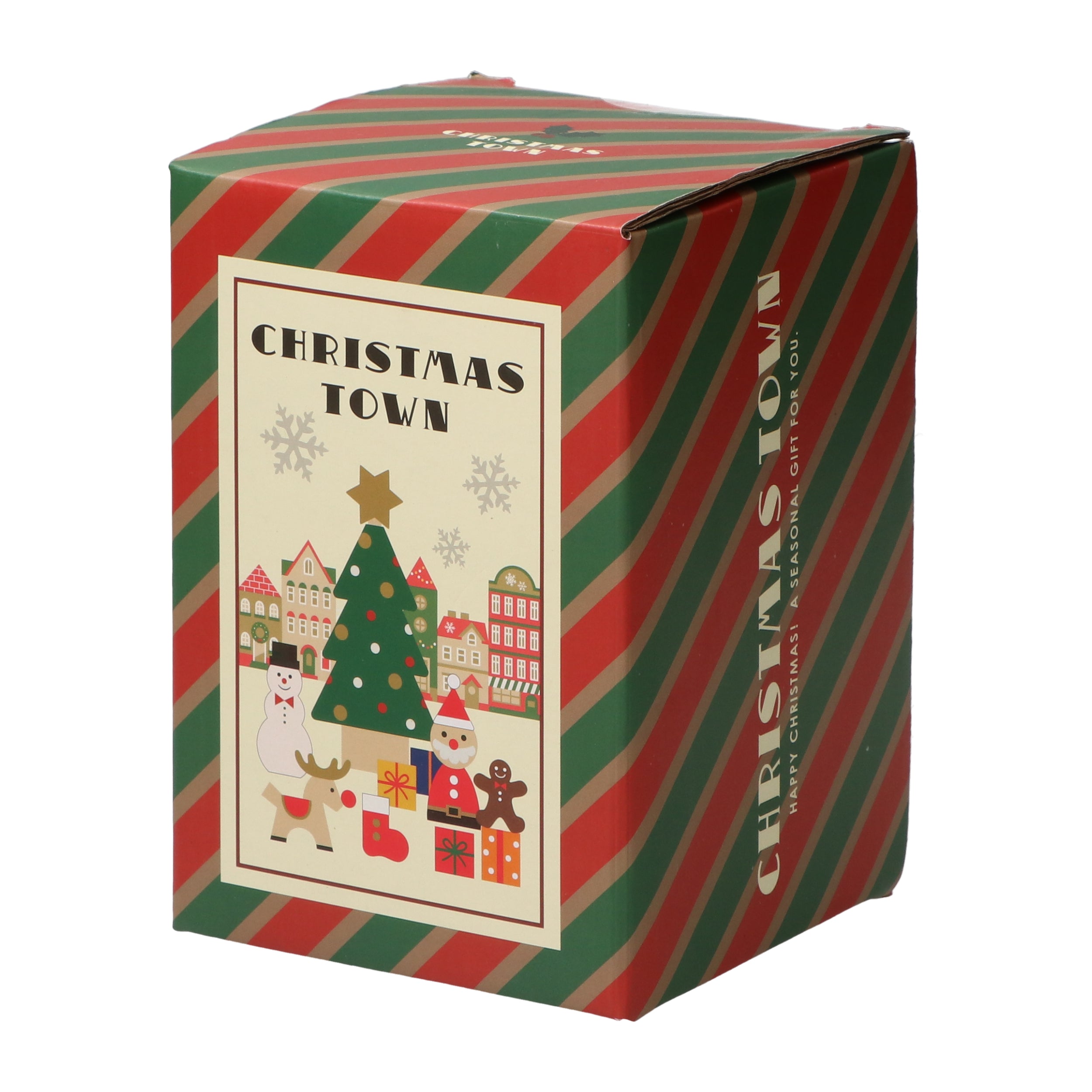 The wooden "Christmas Town" design features a background panel depicting a cityscape and an adjustable hinge for easy display. The