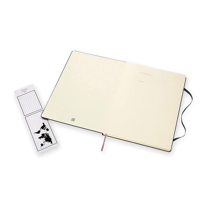 This Moleskine A4 Plain Black Hardcover notebook has signature rounded corners, an elastic closure, an expandable inner pocket, a ribbon bookmark, a front endpaper with 'in case of loss' notice, and 192 70gsm ivory-coloured acid-free pages.