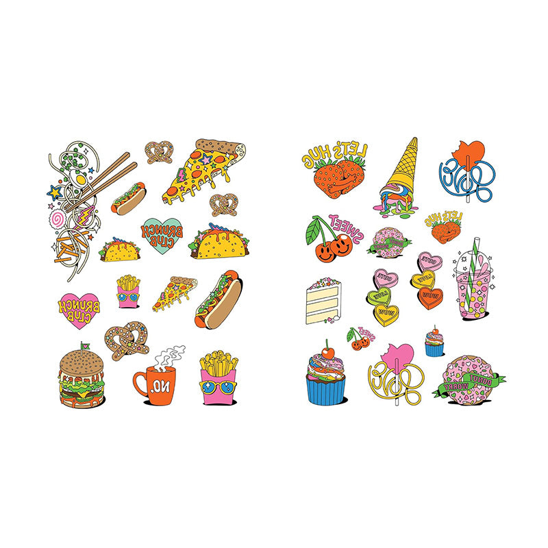 Choose from more than 70 illustrations, from cocktails, cats and coffee mugs to flowers, fruit and fancy furniture. Equally perfect as a stand-alone tat or as part of a larger mix-and-match artwork.