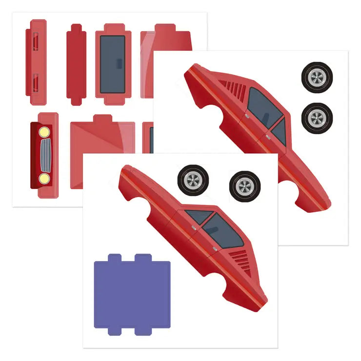 Includes all necessary components to assemble and customize the 3D car—pre‑cut, scored cardboard pieces and an illustrated instruction booklet. -