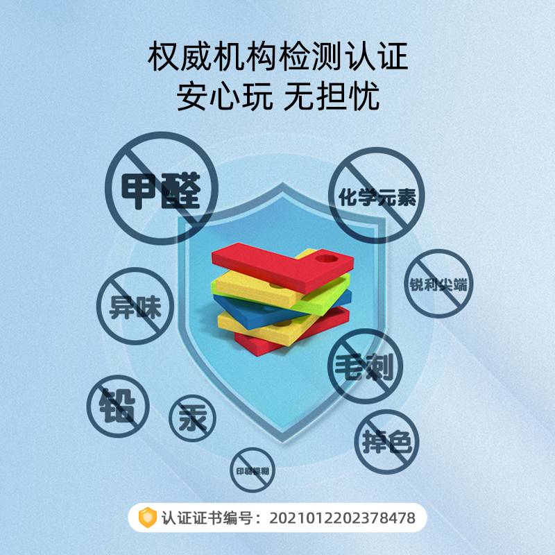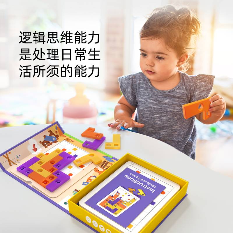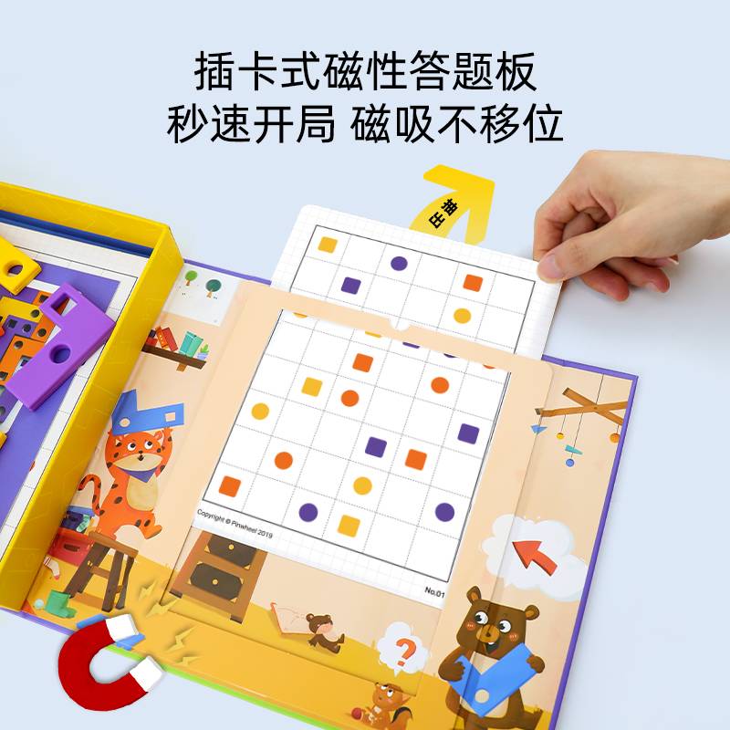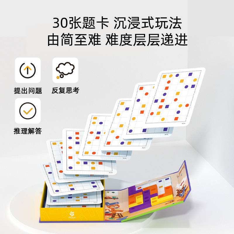 通过游戏题目已知圆点、正方形点颜色位置,将黄、橙、紫三色木块摆放至相应颜色圆点、正方形点位置,最后摆放完成,卡片没有剩余空格。