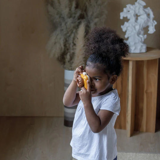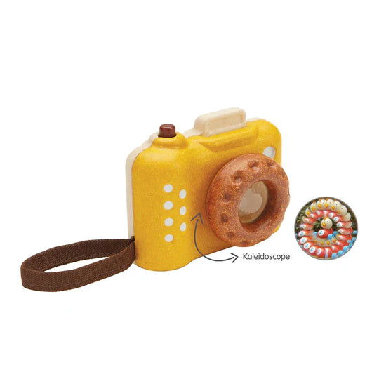 Get picture perfect views of your surroundings with this PlanToys camera. Point, focus, and click the camera and see the different images through the kaleidoscope lens!