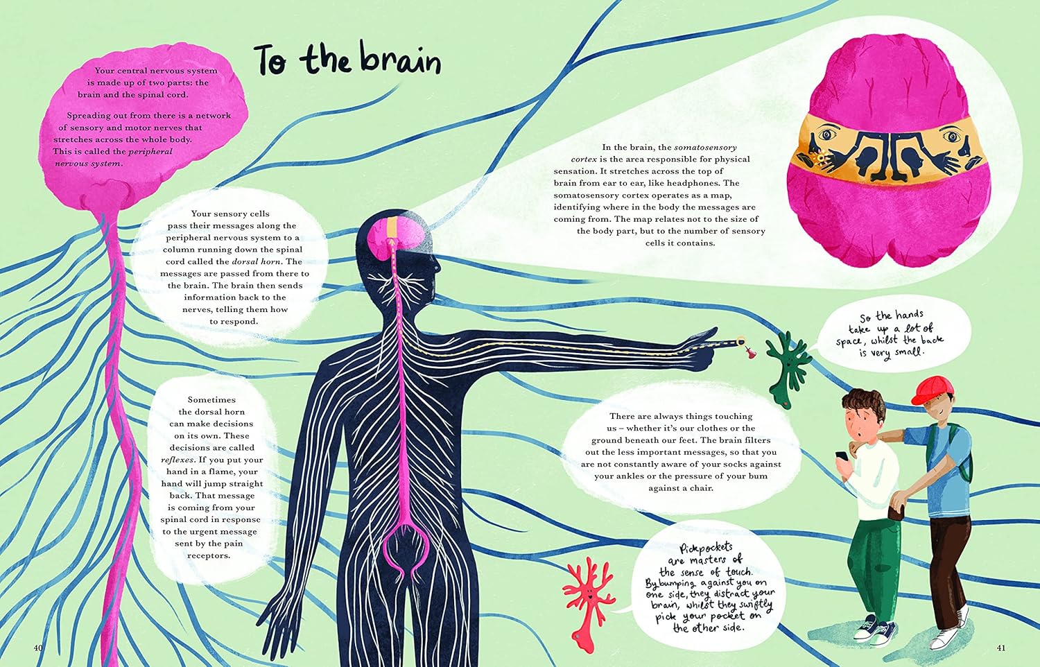 This book takes young readers step by step through the biology of each of the senses. Clear texts are peppered with fascinating facts. Did you know that, unlike the other senses, smells are delivered directly to the parts of our brain that are responsible for memory and emotion, meaning that smells can trigger feelings in a way that sight or sound can’t? Did you know that a cow has about 250,000 taste buds, compared to 5,000 of a human, and a mere 30 of a chicken? Or that earwax is 80% dead skin?