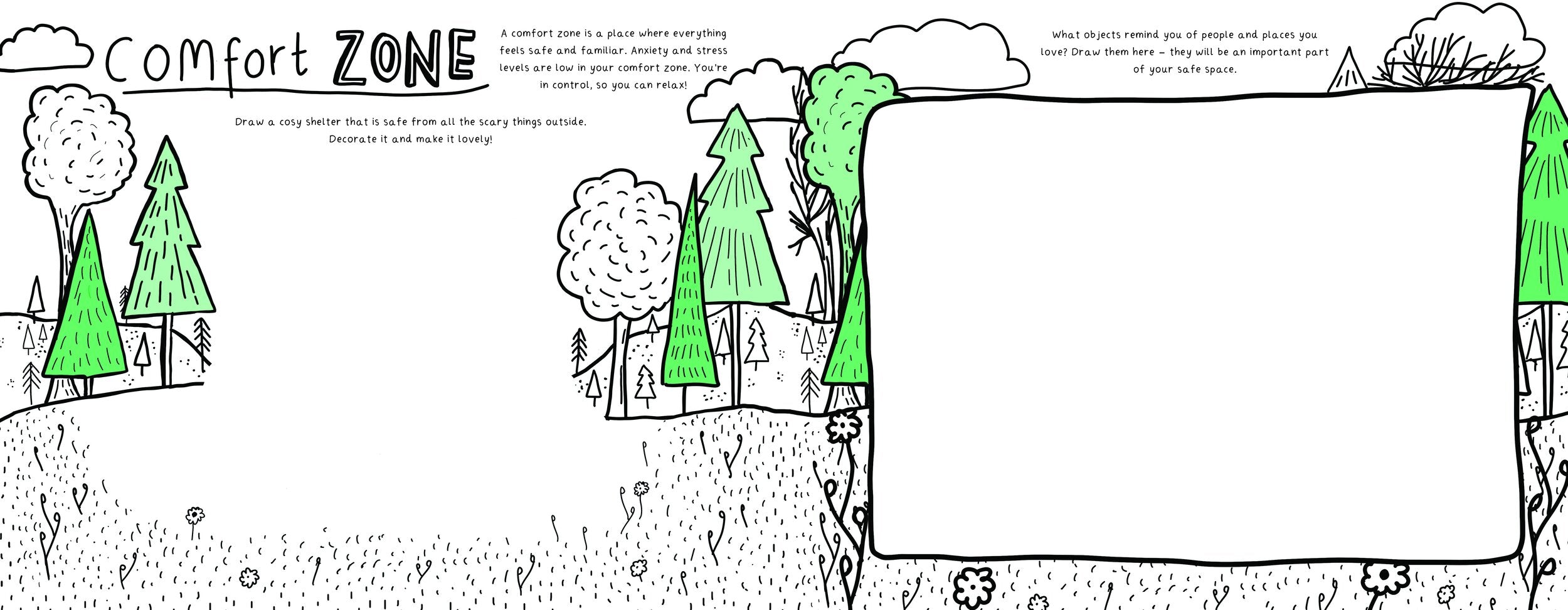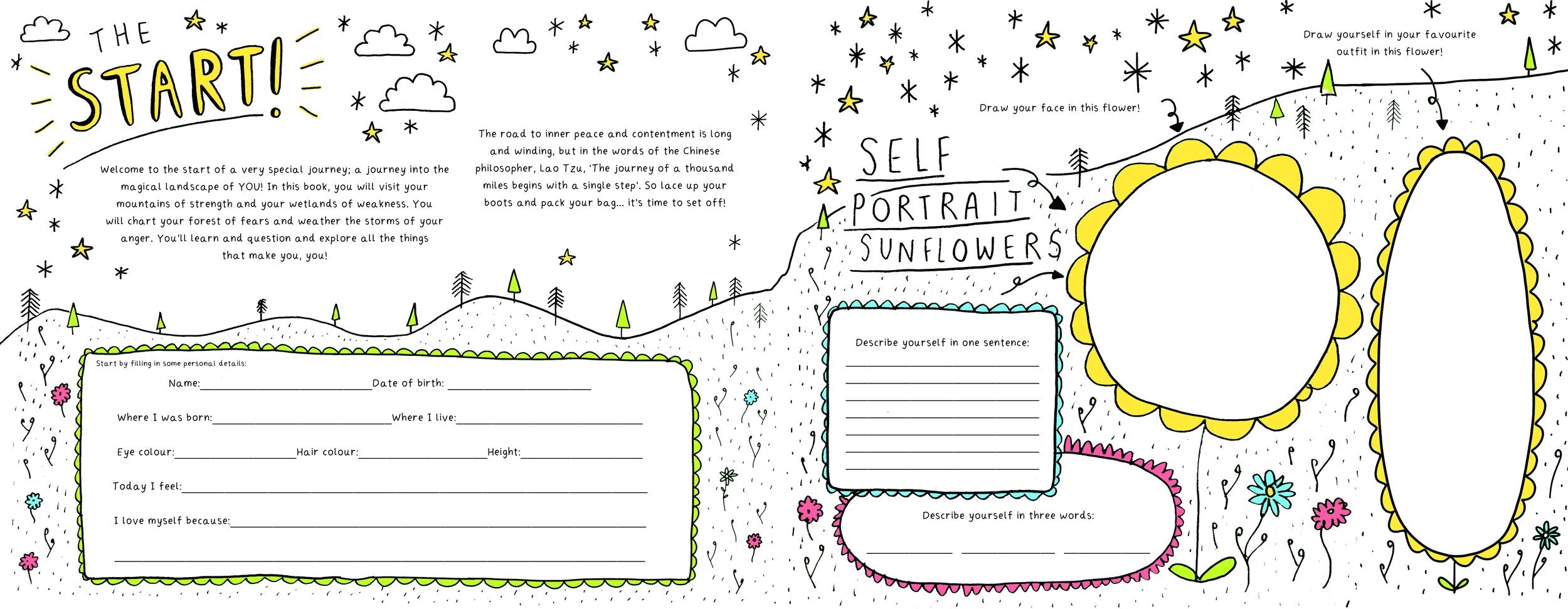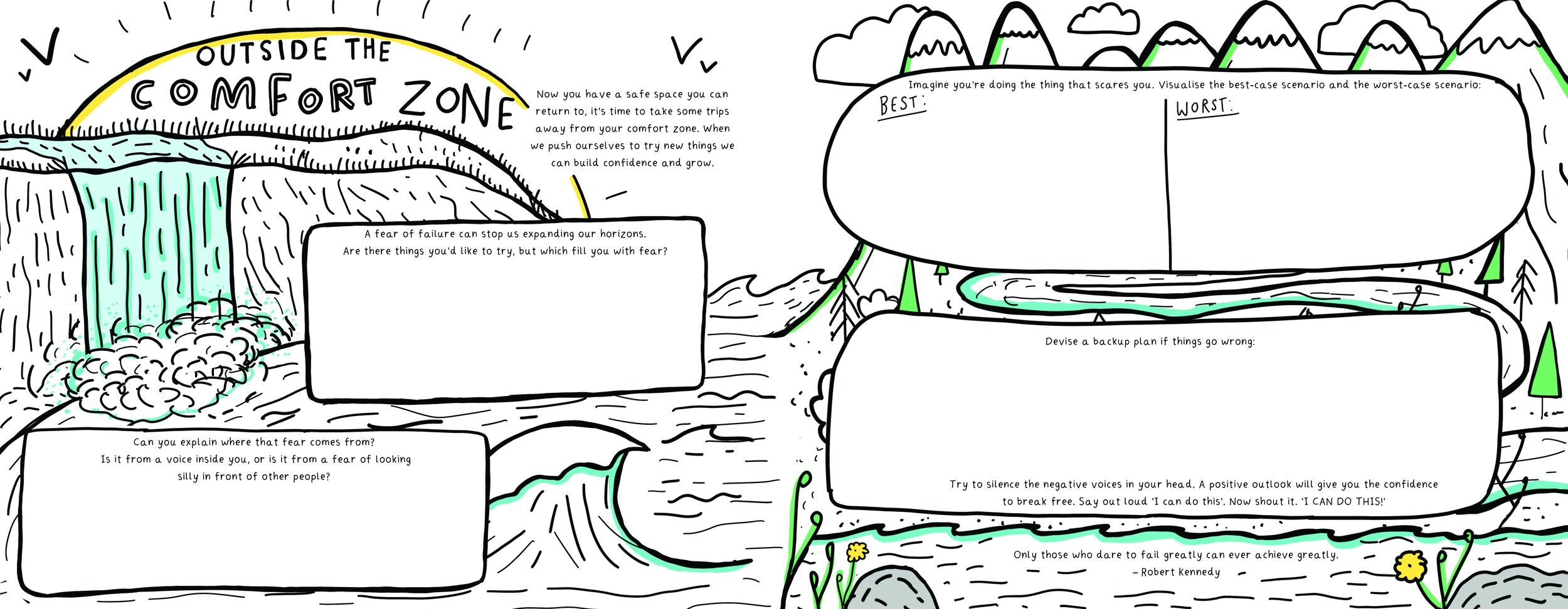 Aimed at children ages 8-13, this book encourages readers to navigate the landscape of their psyche by colouring, writing, doodling, drawing and complet- ing personality quizzes.They are invited to complete their ‘strength mountain’ to explore their ‘wetlands of weakness’, to confront their ‘forests of fears’, and to take comfort in their ‘islands of interests’.