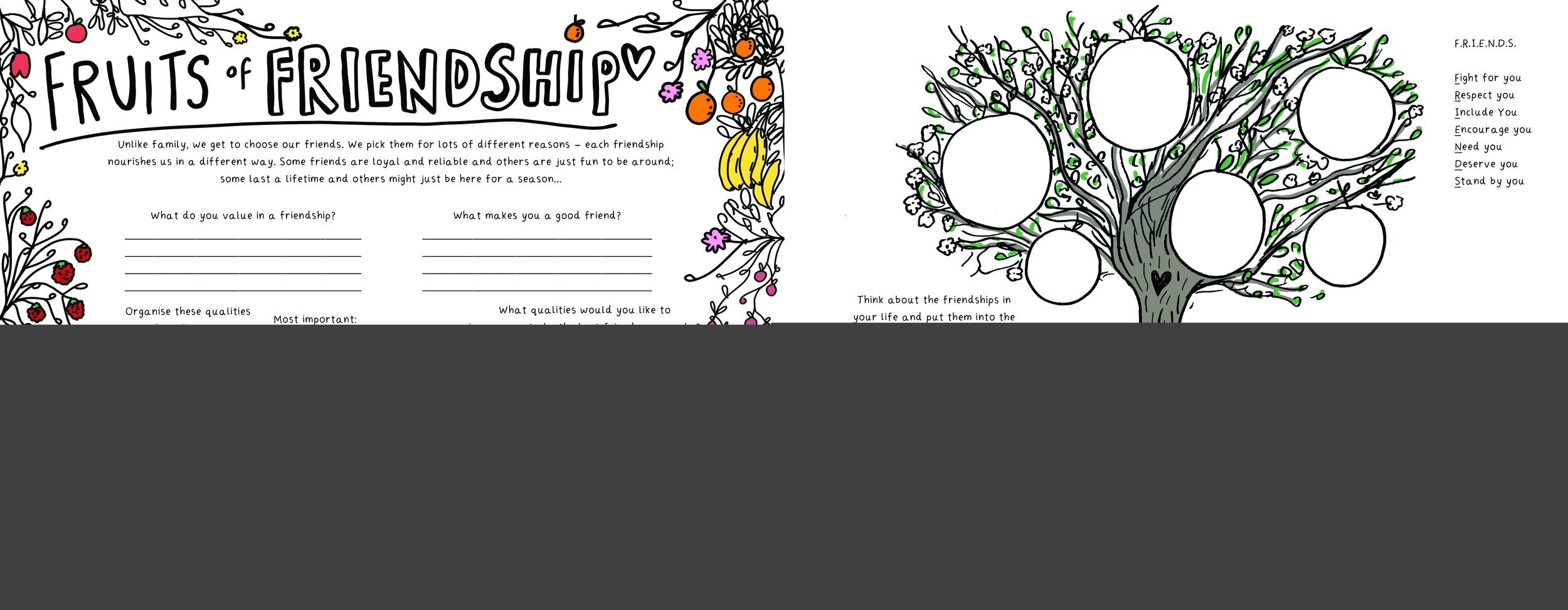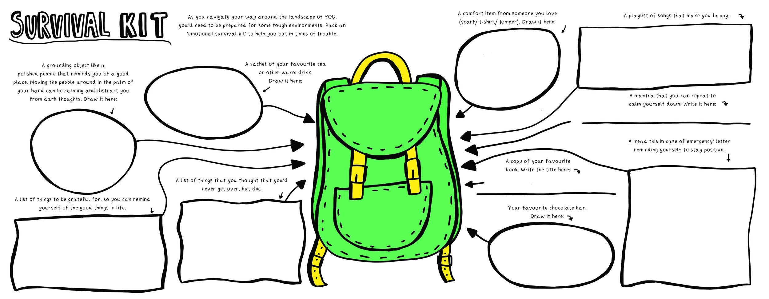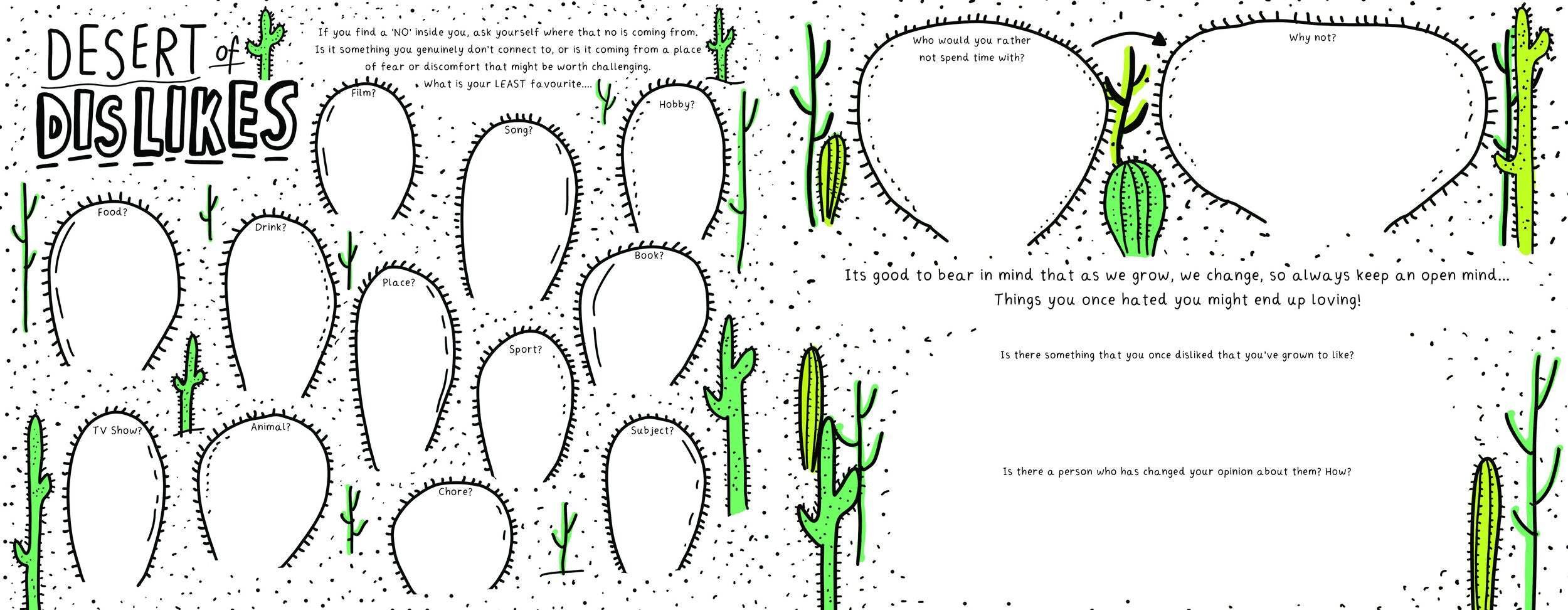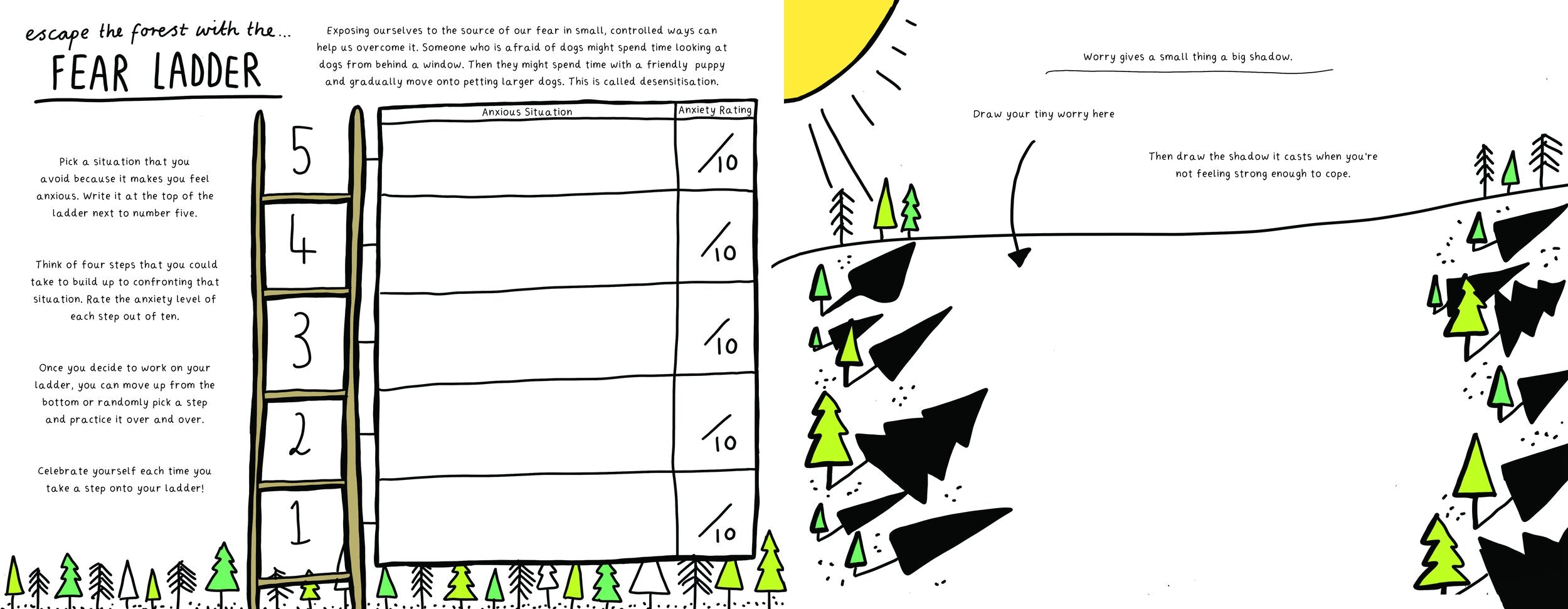 Aimed at children ages 8-13, this book encourages readers to navigate the landscape of their psyche by colouring, writing, doodling, drawing and complet- ing personality quizzes.They are invited to complete their ‘strength mountain’ to explore their ‘wetlands of weakness’, to confront their ‘forests of fears’, and to take comfort in their ‘islands of interests’.