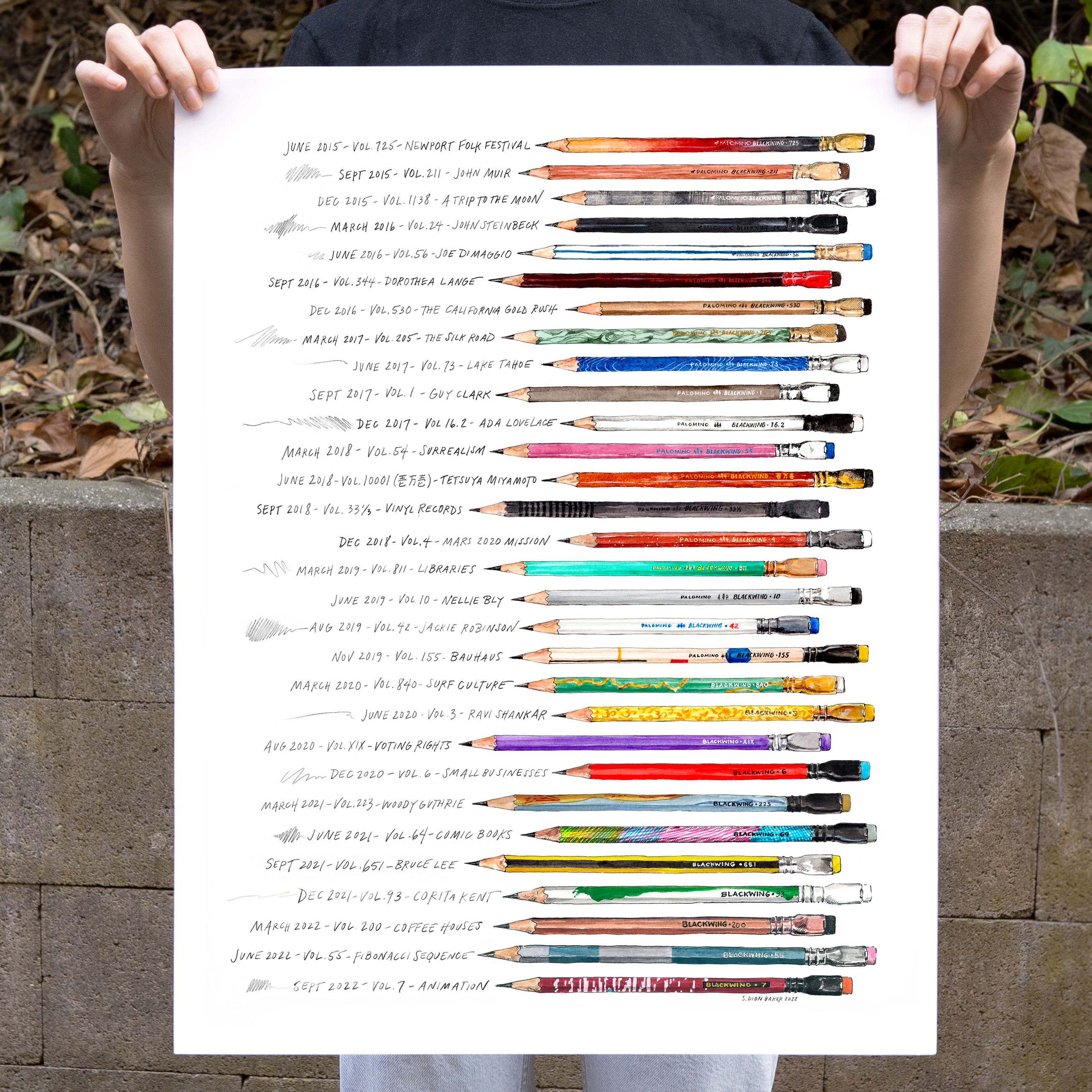 The Blackwing Volumes Print features each of our limited edition Volumes pencils to date from our first release the Blackwing 725 to the Q3 2022 release Blackwing 7.