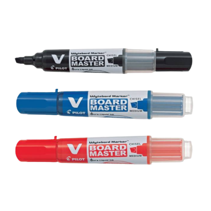 Pilot?s V Board Master is a refillable liquid ink whiteboard marker. Refilling the marker can be done by simply replacing the ink cartridge. The innovative twin pipe feed system (TPF system) ensures stable and consistent writing that is bright and dense from first to the last drop. You will be delighted with the intensity and luminosity of the colours of the V-Board Master.