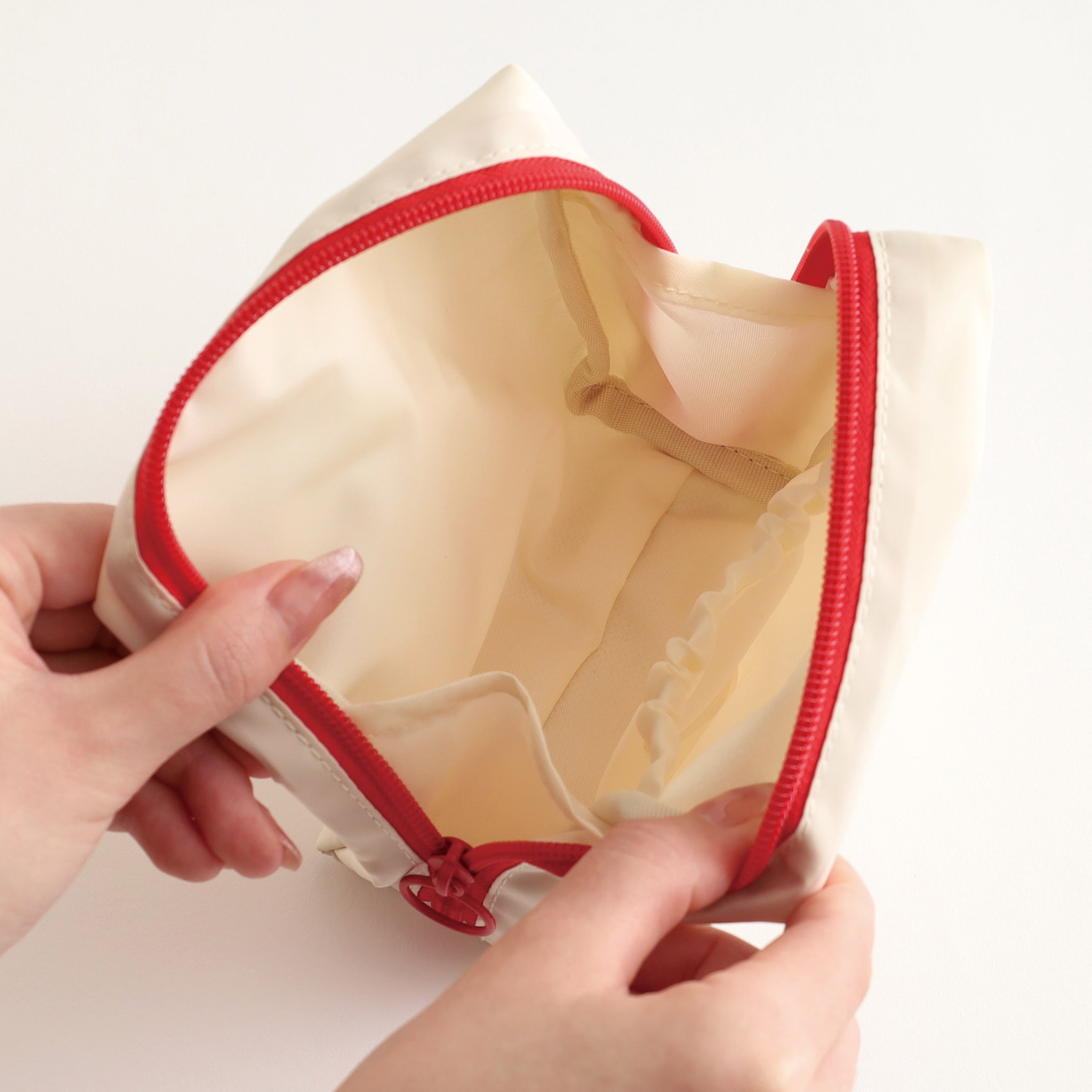 A square pouch with a wide gusset, made of lightweight, wrinkle-resistant matte polyester fabric. It has a wide opening and an inner pocket, so it can also be used as a gadget case.