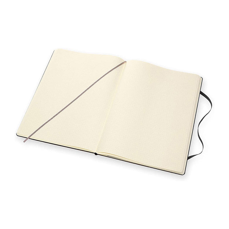 This Moleskine A4 Dotted Black Hardcover notebook has signature rounded corners, an elastic closure, an expandable inner pocket, a ribbon bookmark, a front endpaper with 'in case of loss' notice, and 192 70gsm ivory-coloured acid-free pages.