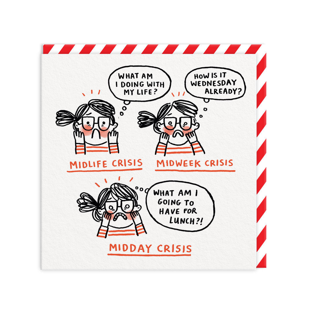 It's illustrated with a woman having a mid-life, mid-week and midday crisis- perfect for anyone enduring a busy week.