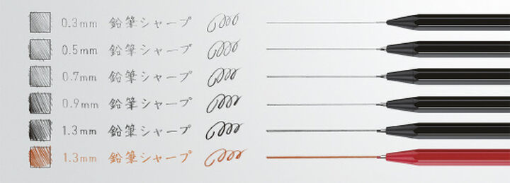 The pencil's distinct lines are also reproduced in a range of 0.3mm to 1.3mm.