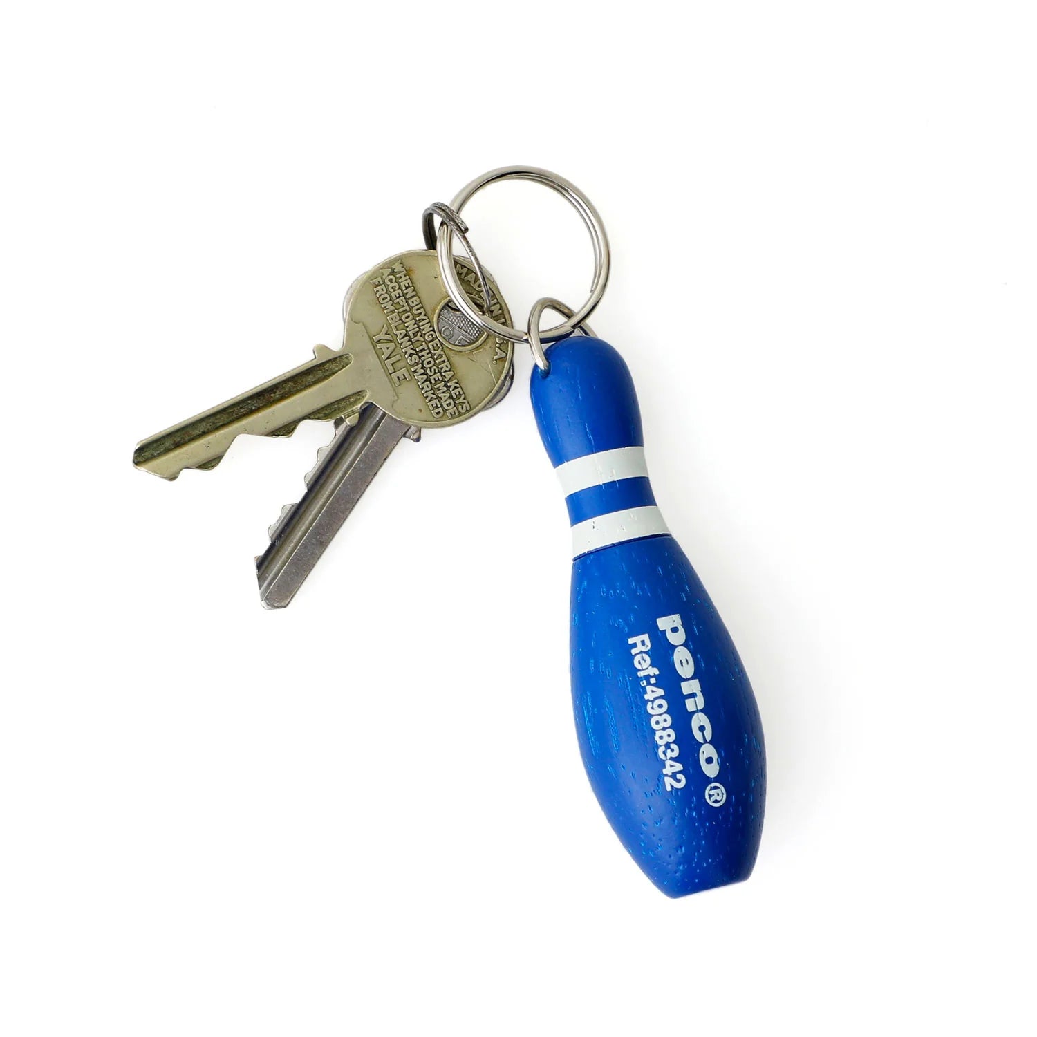 A ballpoint pen keychain in the shape of a miniature bowling pin by penco.