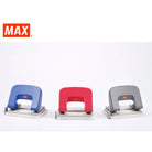 MAX 2 holes punch. Compact and stable design. Conventional pushrod with built-in adjustable paper guide bar and lock function. Available in 3 colors selection: blue, grey and pink. Size 61(l)x15(w)x5(h)mm