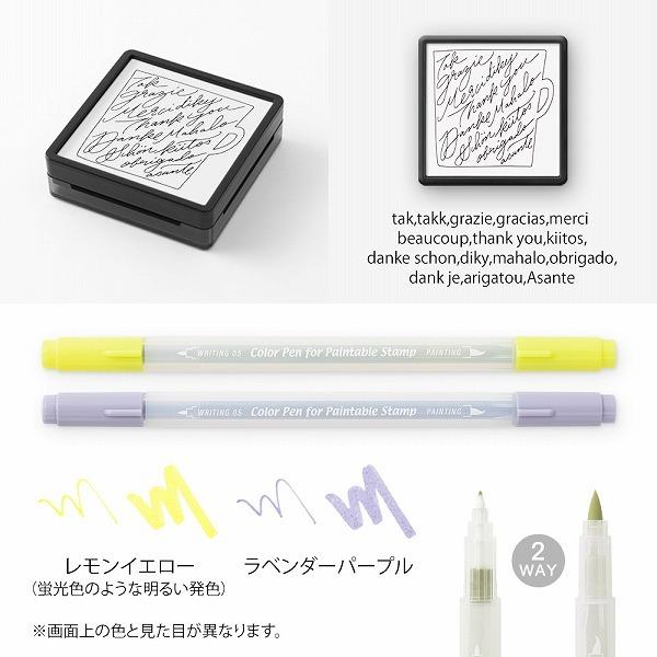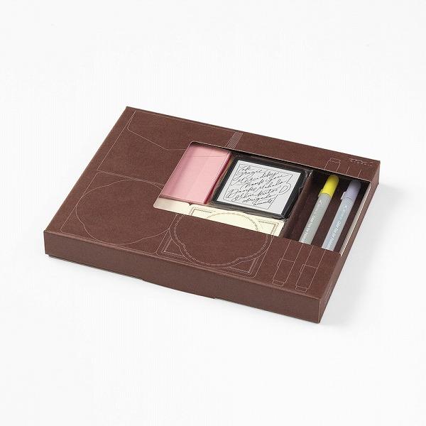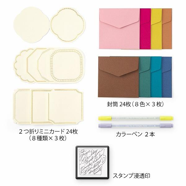 Limited Edition Set of Paintable Stamp, Color Pens, Mini Cards and Envelopes. The stamp pattern is designed by a popular calligraphy artist, Ms. Mikiko Amemiya. Since the calligraphy text looks like a picture, you can create a beautiful gift card just by stamping on the card.