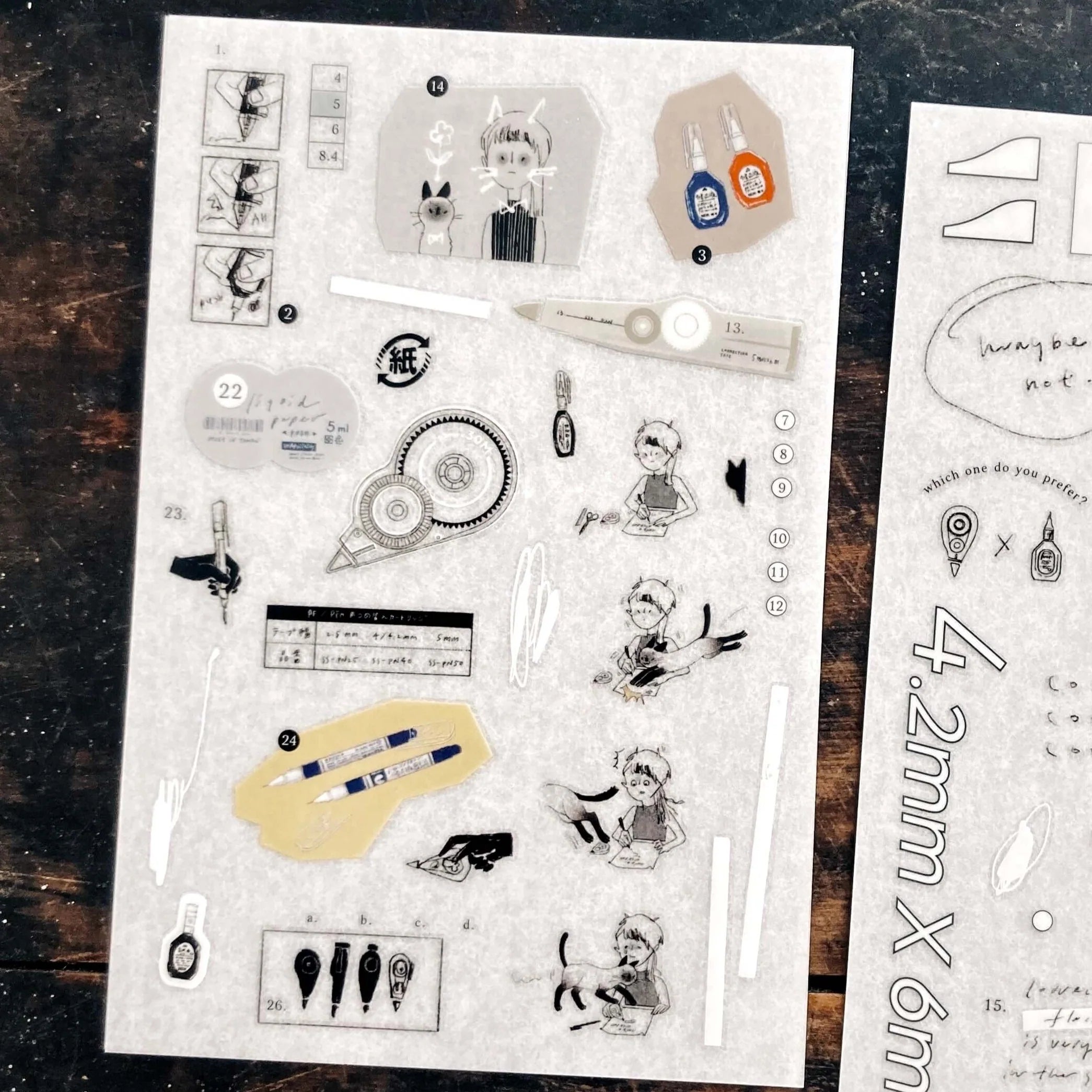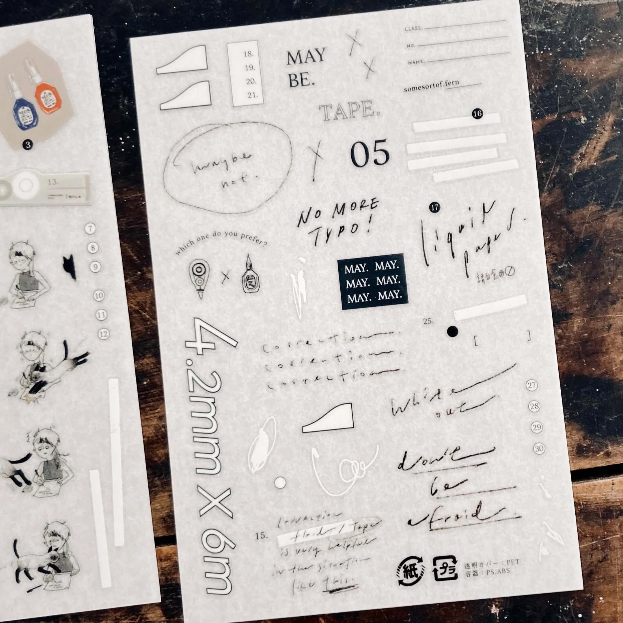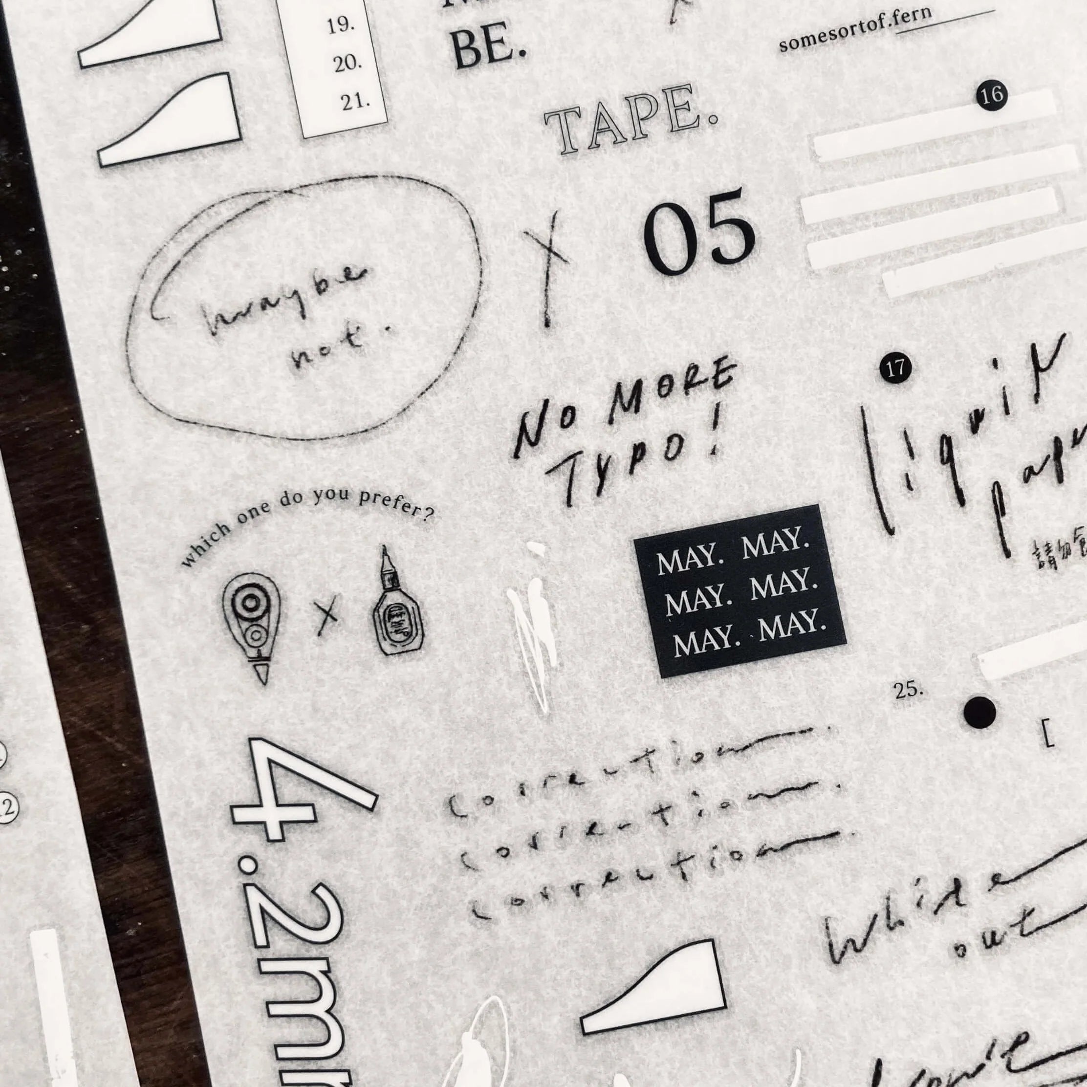 A unique blend of design and functionality for all your creative needs. These stickers feature designs inspired by correction tape and liquor, along with elements crafted by the designer. Perfect for scribbling on paper, it invites you to explore endless possibilities. With elements crafted by the designer, these stickers capture the essence of these everyday tools in a delightful and artistic way.