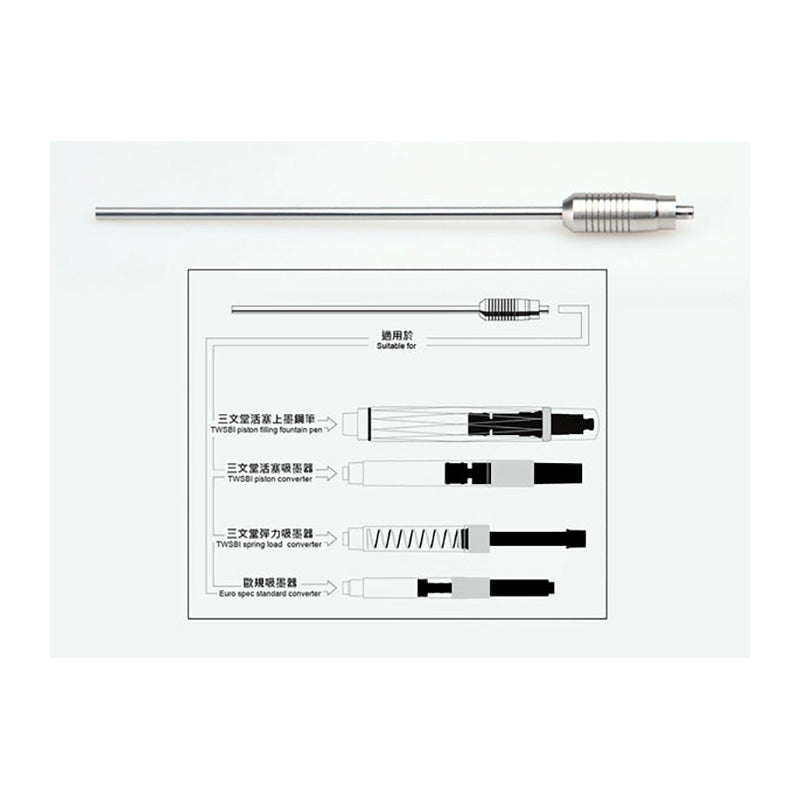 Stainless Pipe extension to help you get to the bottom of ink bottles. Fits our Diamond series fountain pens: 580s, 580AL, 580ALR, 580RG, Diamond Mini, Diamond Mini AL, Diamond Mini RG. Also fits our converters: spring converter, traditional converter. (Top fitting standard international hole size).