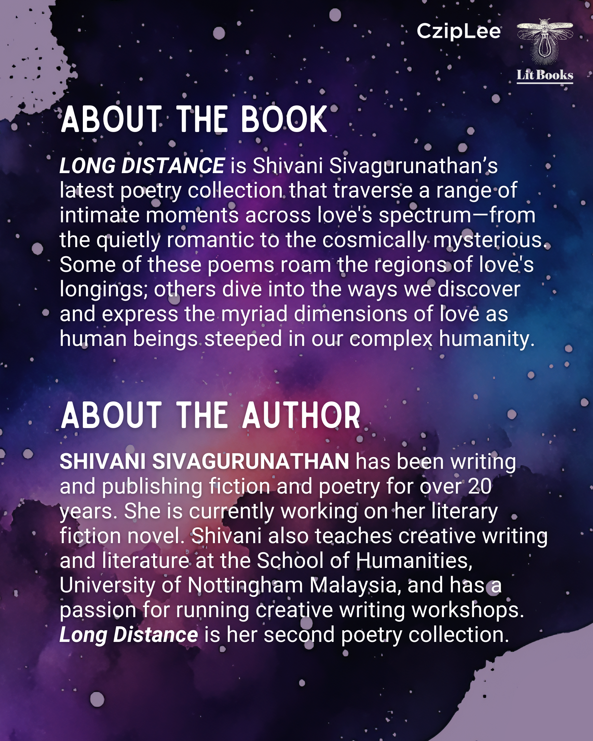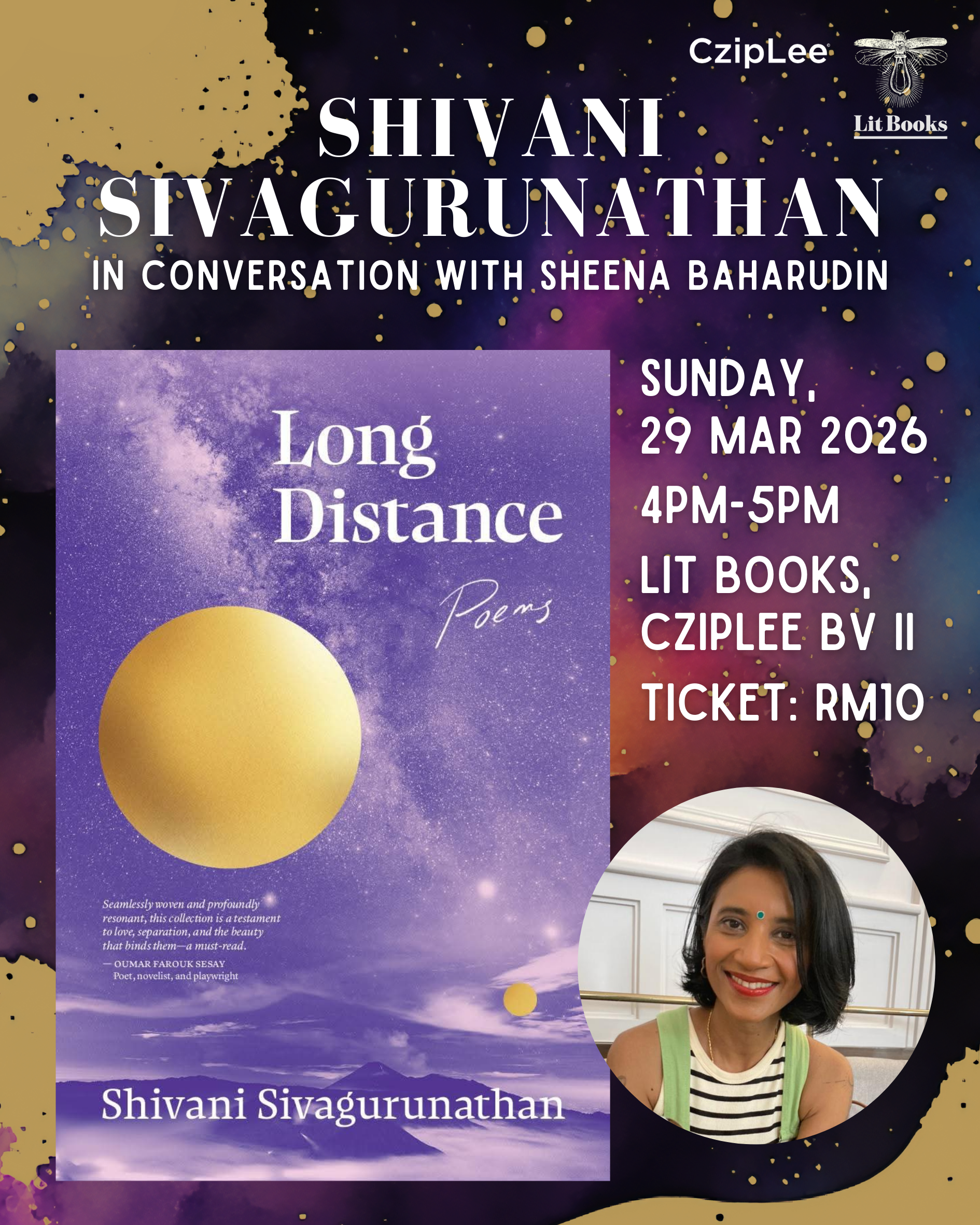 Join us as we welcome Malaysian poet, writer and educator Shivani Sivagurunathan at Lit Books@CzipLee BV2, to discuss her latest poetry collection, Long Distance. The poems in Long Distance explores a range of intimate moments across love's spectrum-- from the quietly romantic to the cosmically mysterious.