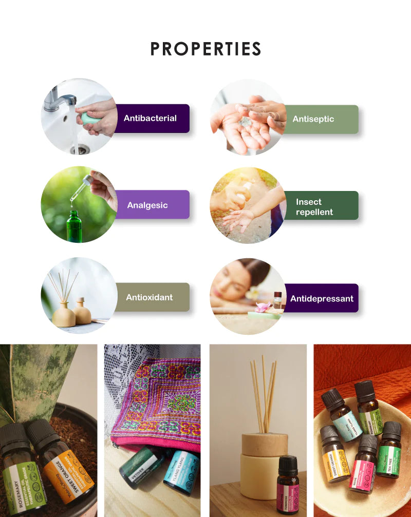 - Campurkan minyak pati (Essential Oil) sebanyak 10 hingga 20 titis ke dalam 30ml minyak pembawa sebelum digunakan.