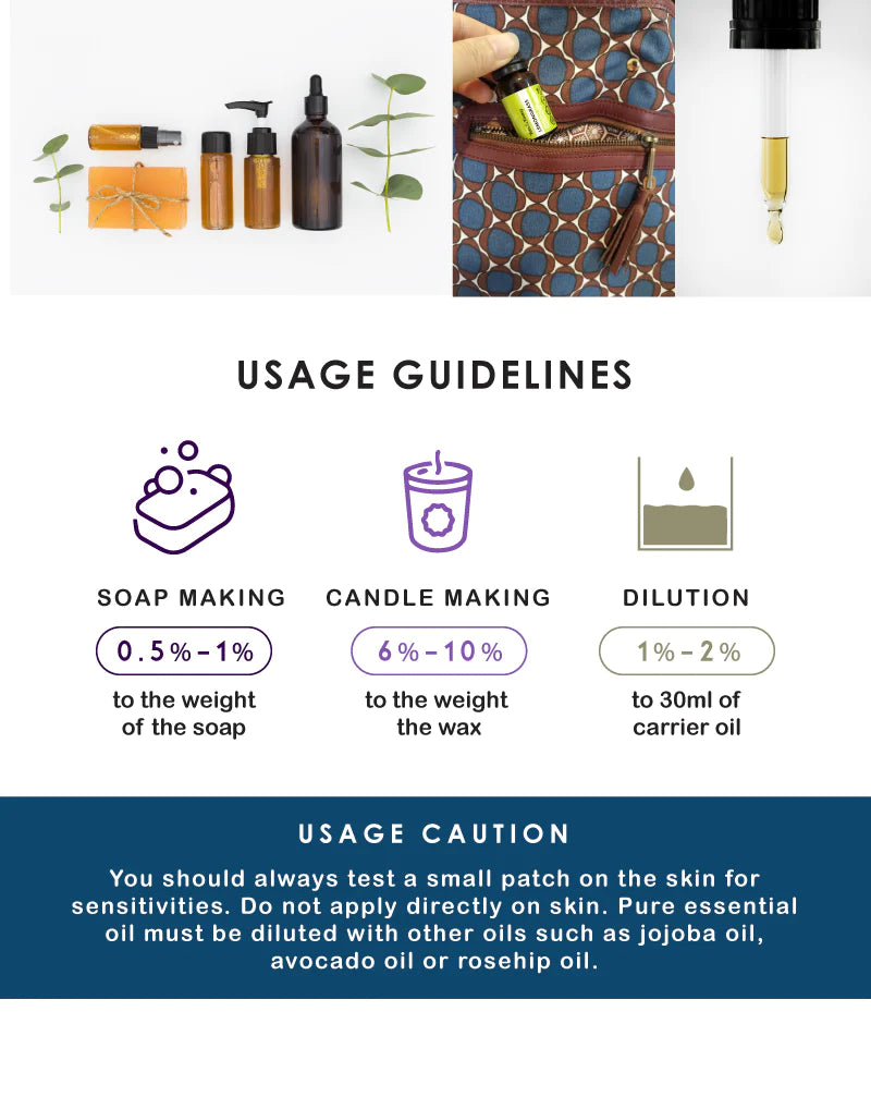 Before applying to the skin, dilute essential oils with a carrier oil. Do not apply directly on the skin. In general, use 1-2% of essential oil to 30ml of carrier oil. Always test a small patch of skin for sensitivities.