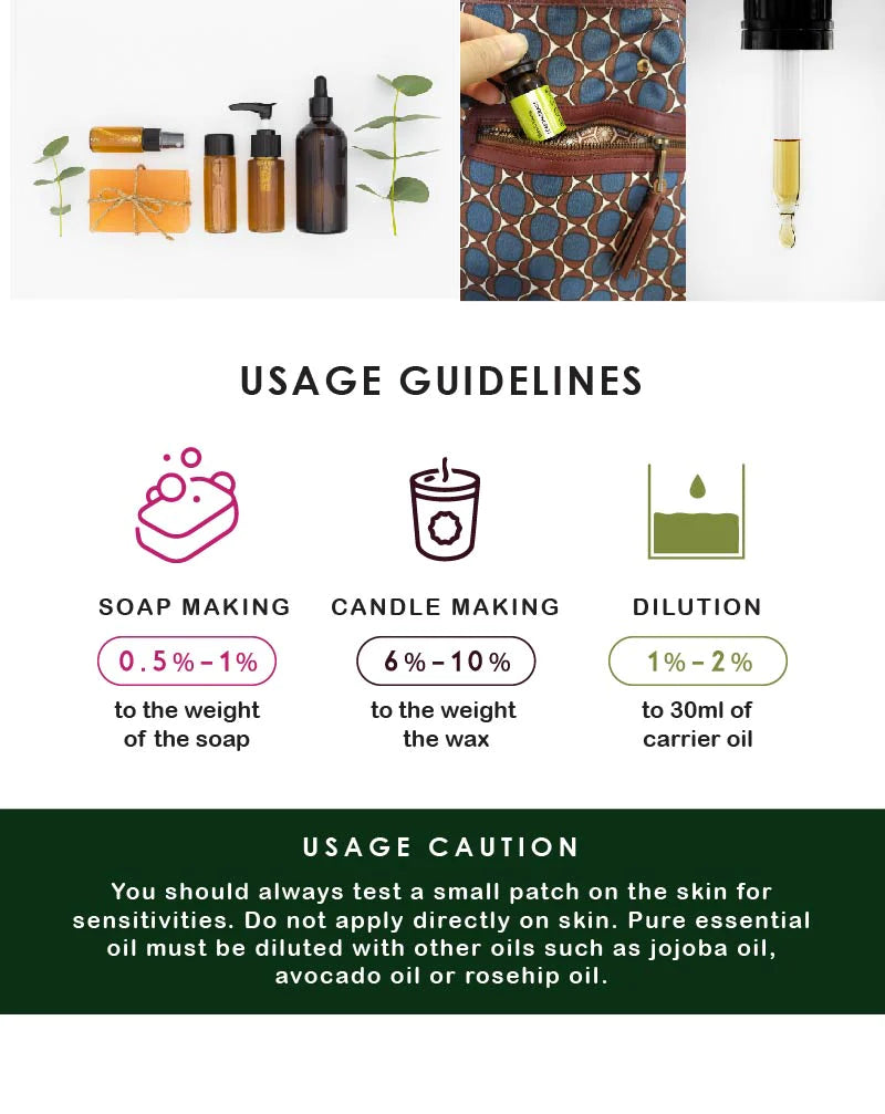 Before applying to the skin, dilute essential oils with a carrier oil. Do not apply directly on the skin. In general, use 1-2% of essential oil to 30ml of carrier oil. Always test a small patch of skin for sensitivities.