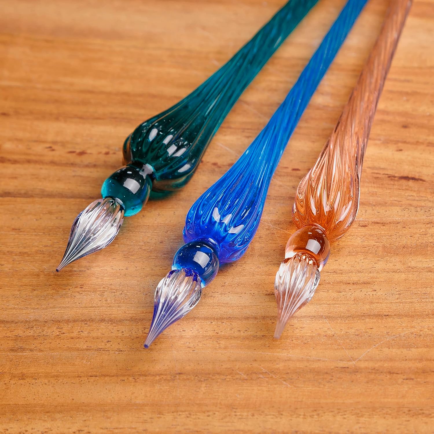 Hand blown glass pens in the tradition of 16th century Venice. Each pen is an individual work of art. The fine glass tips are twisted in a light spiral to hold the maximum amount of ink - enough to write a full page of text without re-dipping.