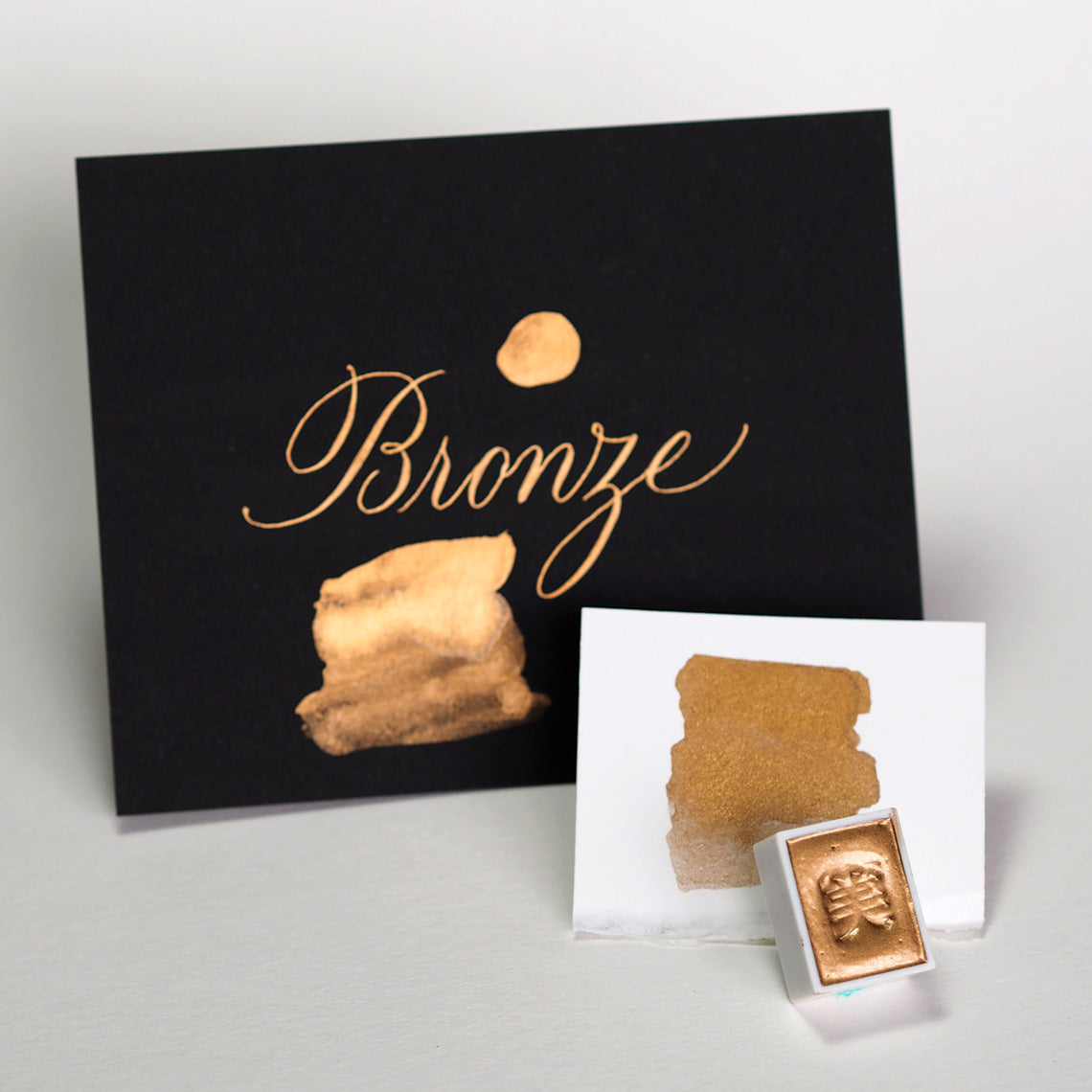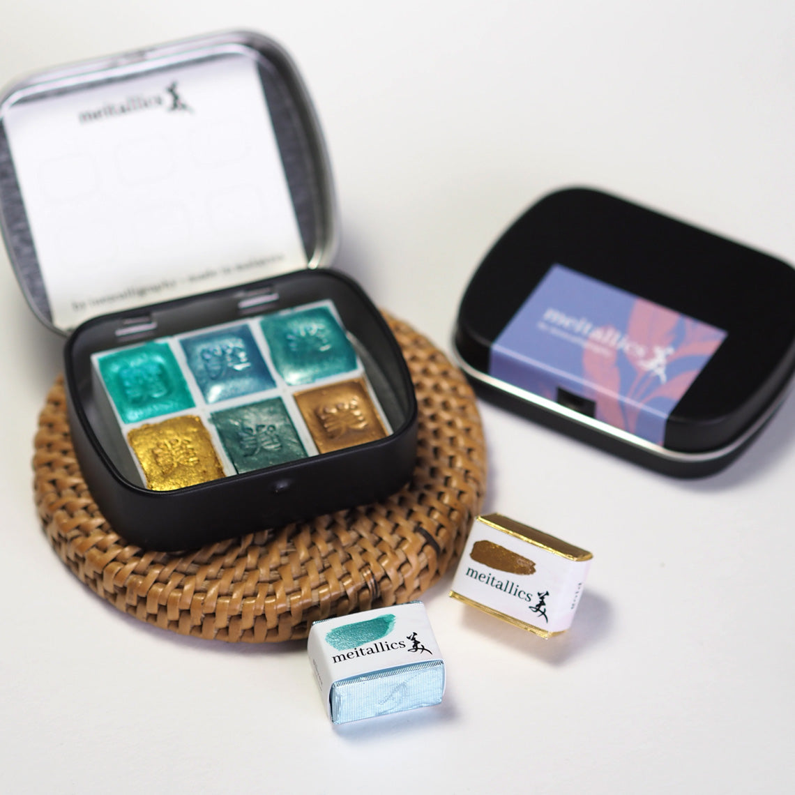 Metallic paints hand mulled in Malaysia & produced in small batches. Perfect for calligraphy, hand lettering and watercolour painting. Production for each colour takes 2-3 weeks as we pour them in layers, which require time for the paint to dry in between layers. This set of 6 includes Coral, Plum, Blue Silver, Pale Gold, Bronze, Gold, and comes in a metal container.