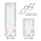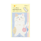 This memo hides your message when folded and reveals it as the animal stretches when opened. Featuring popular "MIDORI" animal motifs, it adds a playful touch to communication. Each set includes two designs, with the cat design showing a stretched body and tangled yarn as a cute detail.