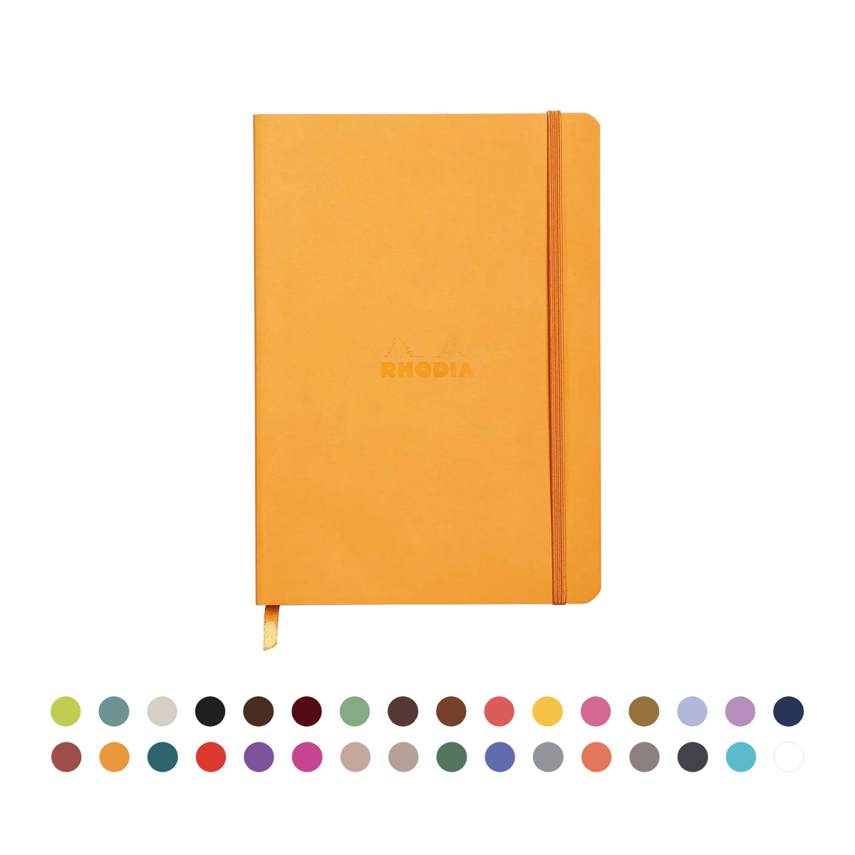 Soft cover in Italian leatherette material with embossed Rhodia logo for an elegant and qualitative notebook. Clairefontaine Brushed Vellum 90 g ivory paper with unequalled softness and remarkable opacity and resistance. PEFC certified for reasoned forest management. Elastic closure to avoid losing any document. Bookmark ribbon to easily find important pages. Orange cover page for a neat finish. Glued Spine for a better hold of the notebook. Gusseted pocket on back cover to organise your documents and transport them easily.
